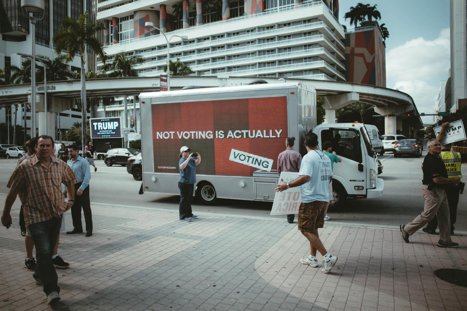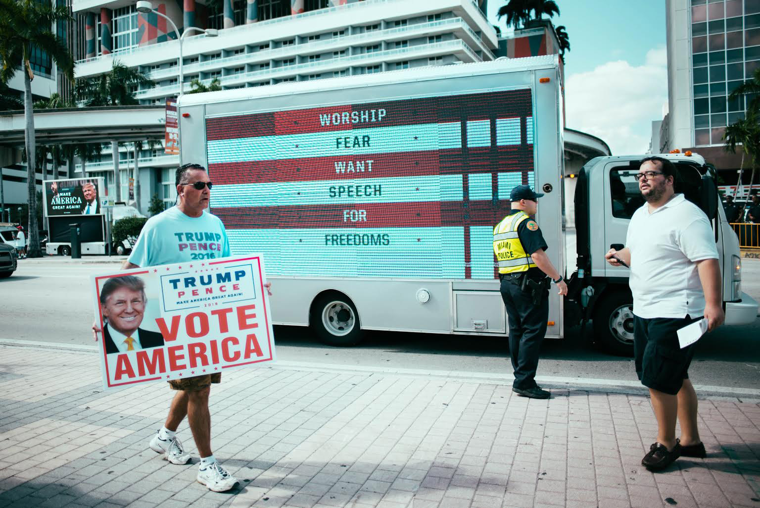 In essence, Thomas acted like an art director—along with Wyatt Gallery—overseeing different “ads” produced by all the artists and designers involved. The team at Summut has been driving it between Trump and Hillary rallies and different events in South Florida, such as the Trump rally last week pictured here which garnered a range of responses from attendees and passer-bys alike.
