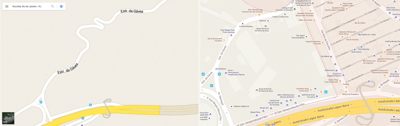Google partnered with AfroReggae—which, since 1993, has been providing cultural and artistic education to youth living in the slums, offering a path away from drug trafficking and violence—for the endeavor. The cultural group has a dedicated project called Tá no Mapa, which translates to “It’s on the map.” Favela residents are trained in digital cartography, tagging streets and landmarks as well as registering local businesses—simply (and discreetly) using their smartphones and the Google Map Maker app. The progress they’ve made since 2014 is staggering, as seen in the before and after photos below; it’s a small section of Rocinha, Rio’s largest favela.