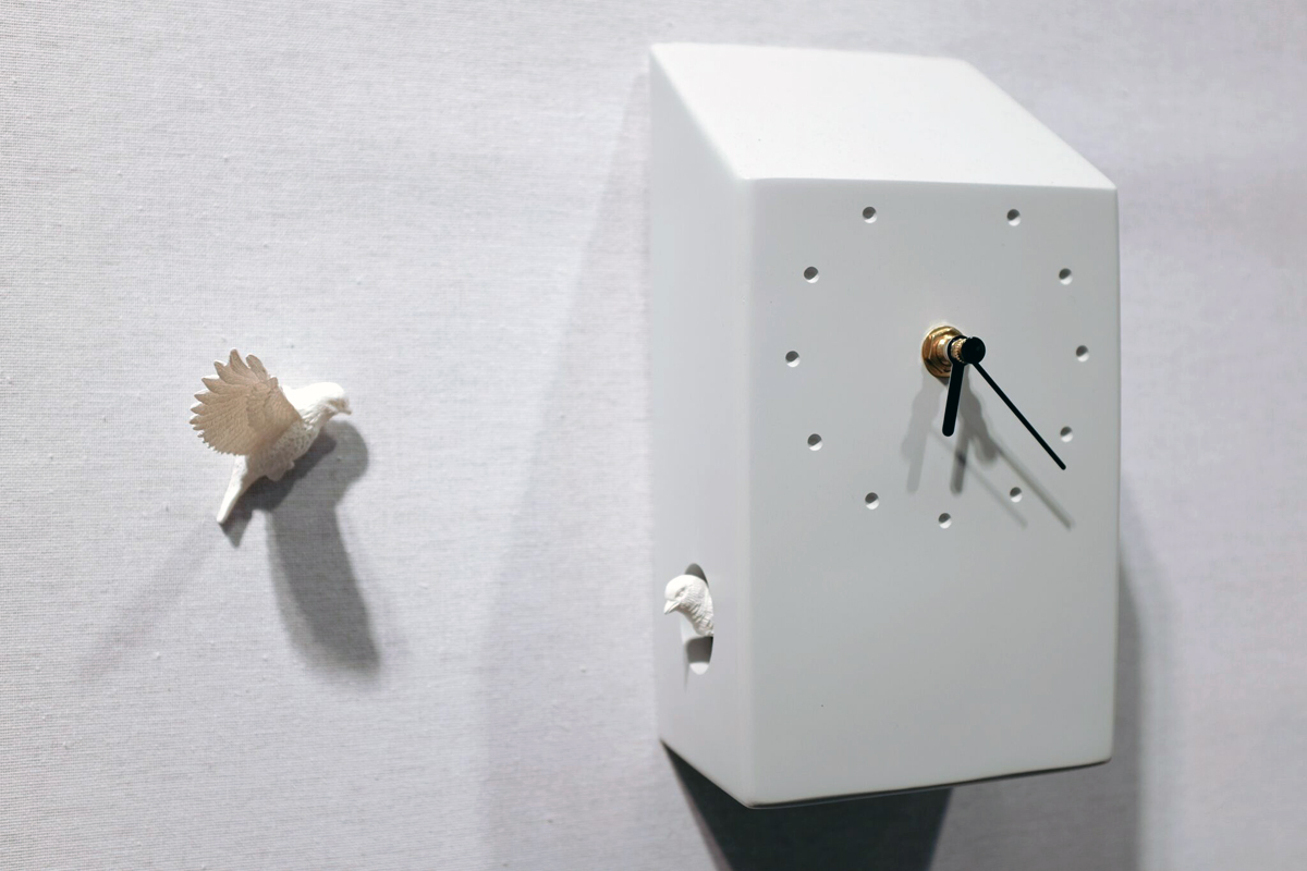 At Diamantini & Domeniconi, we found some of the most striking examples—thanks to the work of Marco Marzini, the creative director for just over a year. Marzini focused on the historical models of the Italian house but he also introduced new models, all sharing a desire to show what is usually hidden. The industrial meets the playful with the Attimo cuckoo clock, defined by a lacquered steel case and visible movement. The ultra-pure Angolo is not just for the wall, because thanks to a portable magnetic base it can be placed on a table or inserted between shelves on a bookcase.