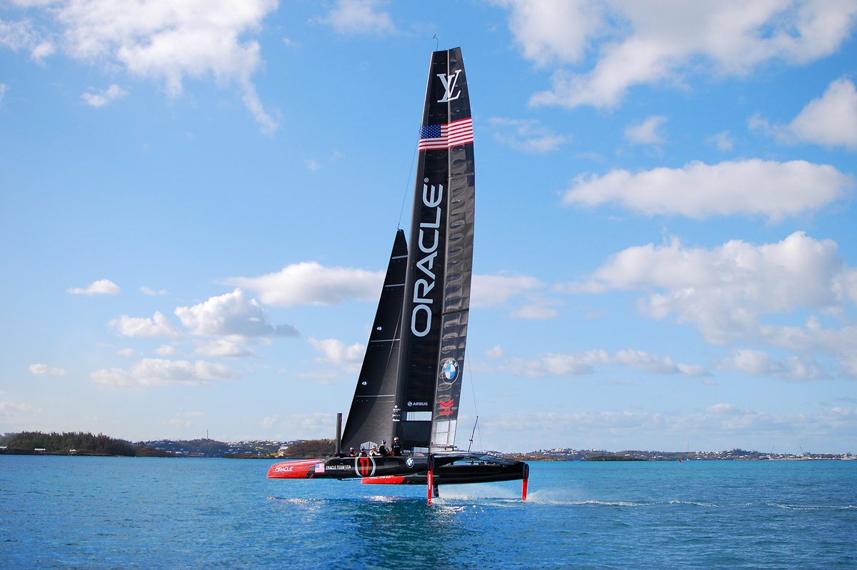 On a recent visit to Bermuda, we had a chance to see Team USA out on the water in practice mode, preparing to defend the title for the third consecutive race. Training starts with a 45-minute process of taking the base platform out from the hanger it’s stored in and attaching the wing with a crane. The wing is actually a rigid sail affixed to the platform by a rotating sphere, which gives the the trimmer the flexibility to move it around like a normal sail.