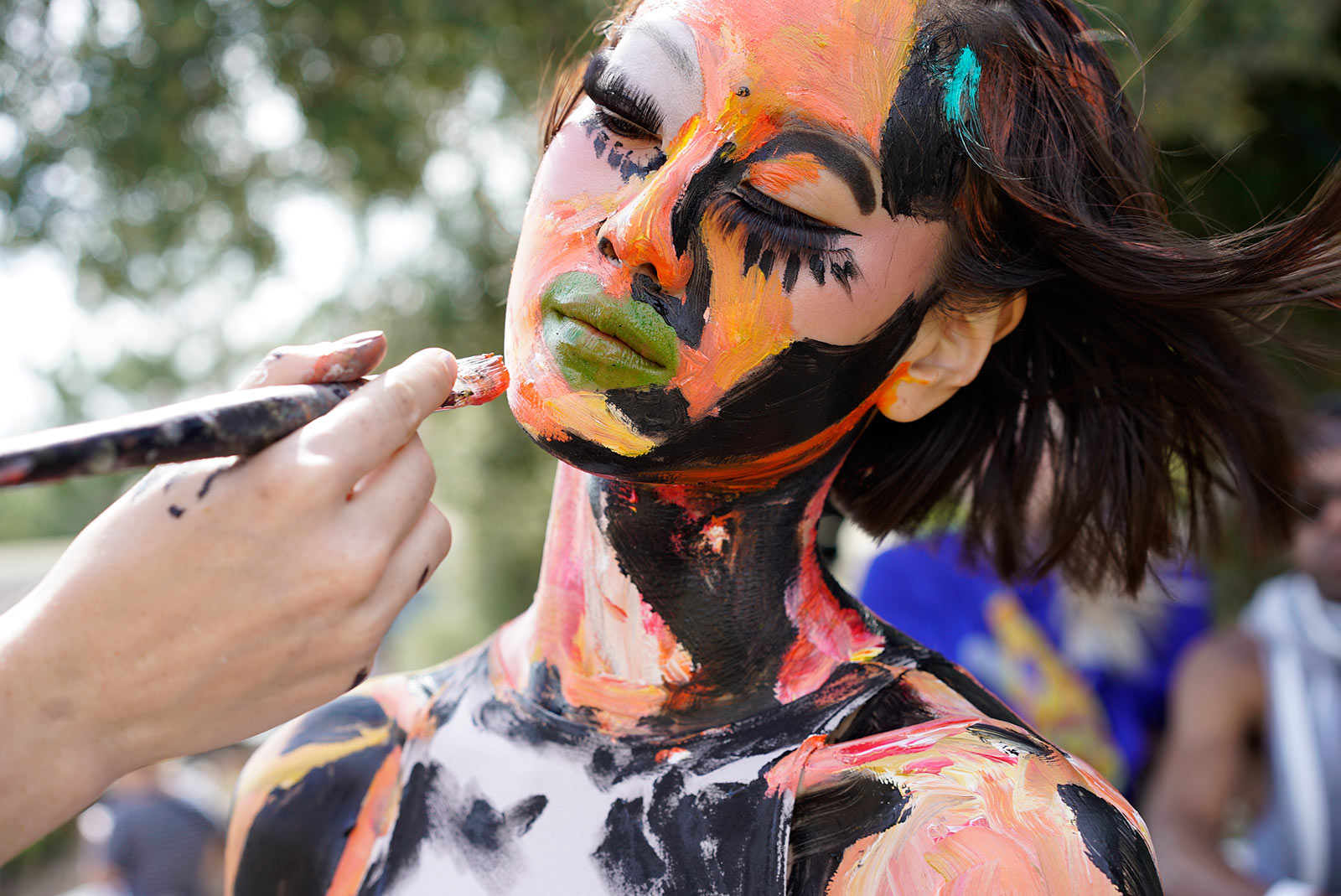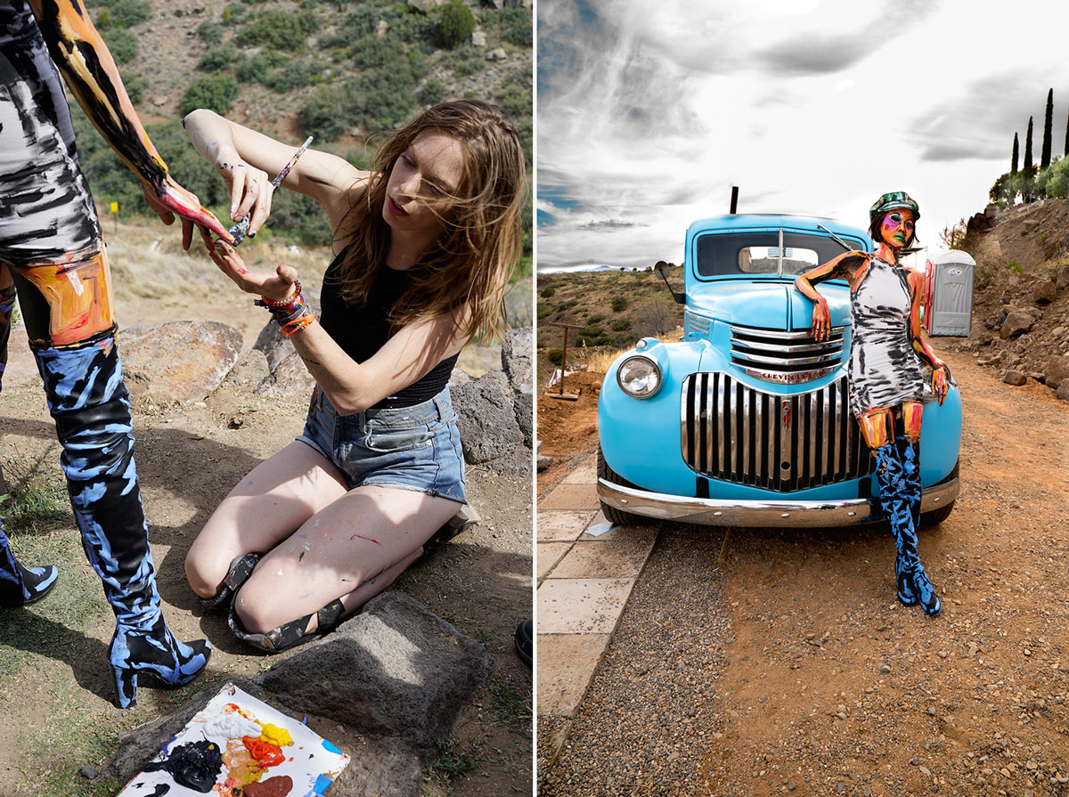 The words “live painting” invoke a couple of different images for me: a graffiti artist in the middle of the night, or even Bob Ross talking to the camera and patiently explaining a new technique. Alexa Meade, however, has made the term entirely her own. She’s ditched the easel and brought the brush to human skin, transforming breathing, moving bodies into a dimension between 2D and 3D; incorporating photography (she shoots everything herself), video and performance, too. Her unusual technique first caught our eye back in 2010, and we were able to see Meade at work recently in an equally unusual setting: the unreal music festival FORM Arcosanti, which took place in an experimental desert town in Arizona.
