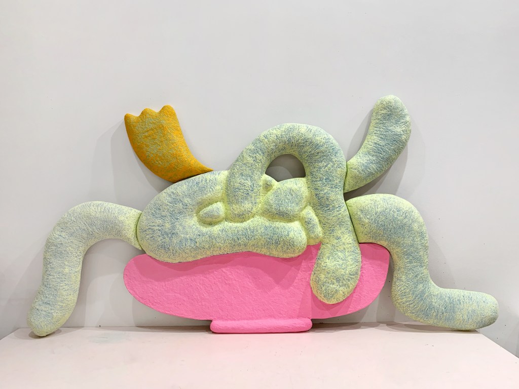 Vadakan and Myung also help to co-curate artwork for the lobby. Currently on view is a series of gloriously goopy-looking pastel sculptures by Chiaozza. The pieces in the collection, called Sunday Succulents, take the shape of ice cream bowls and are crafted from painted paper pulp.