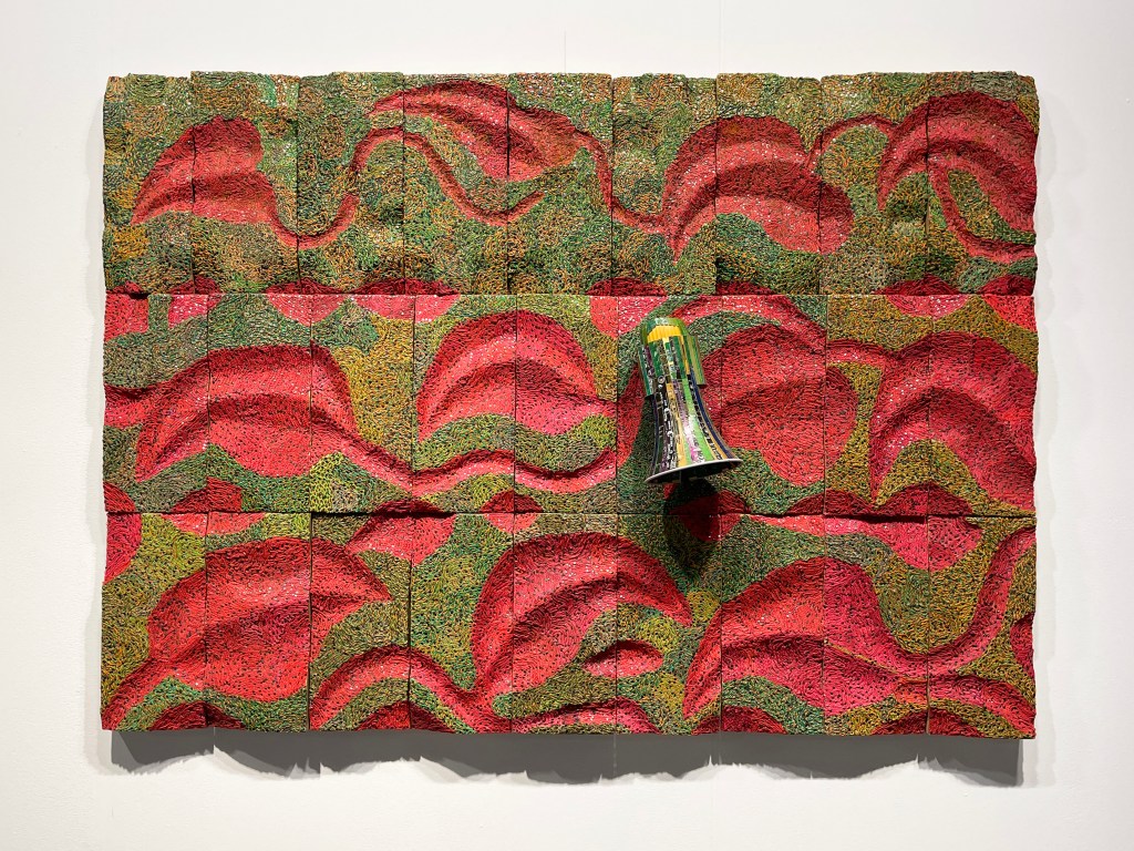Addis Ababa, Ethiopia-born Elias Sime transforms reclaimed materials into intricately woven or layered works. With “TIGHTROPE:ECHO!?” (2021), presented by James Cohan Gallery, the artist assembles reclaimed electrical elements atop a panel, with one megaphone finalizing the vision.