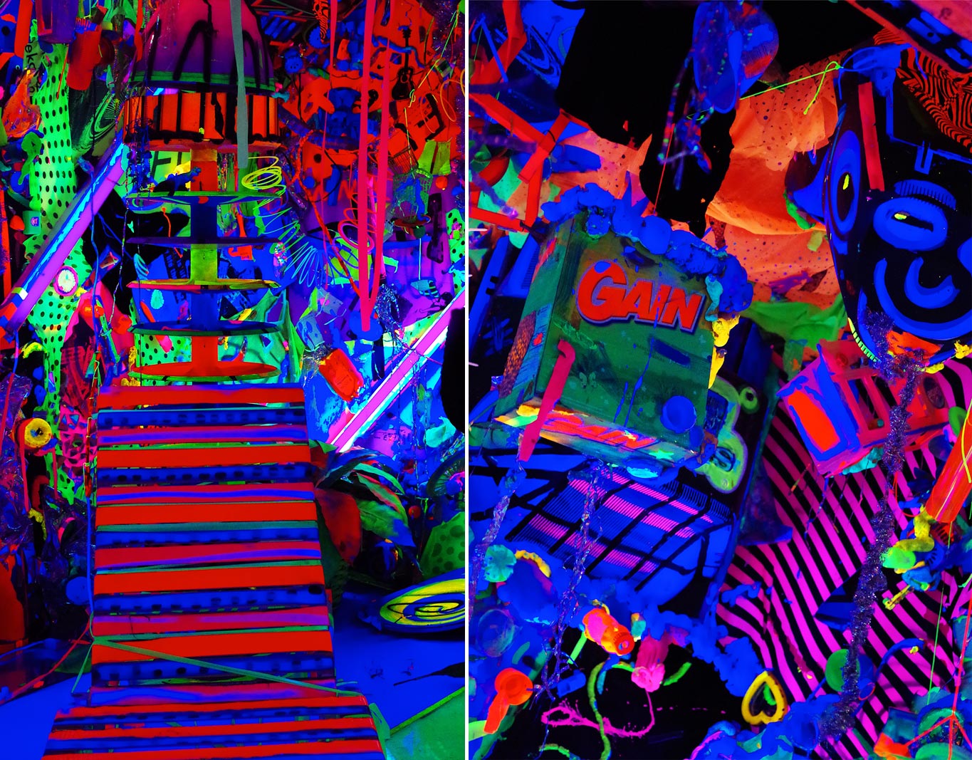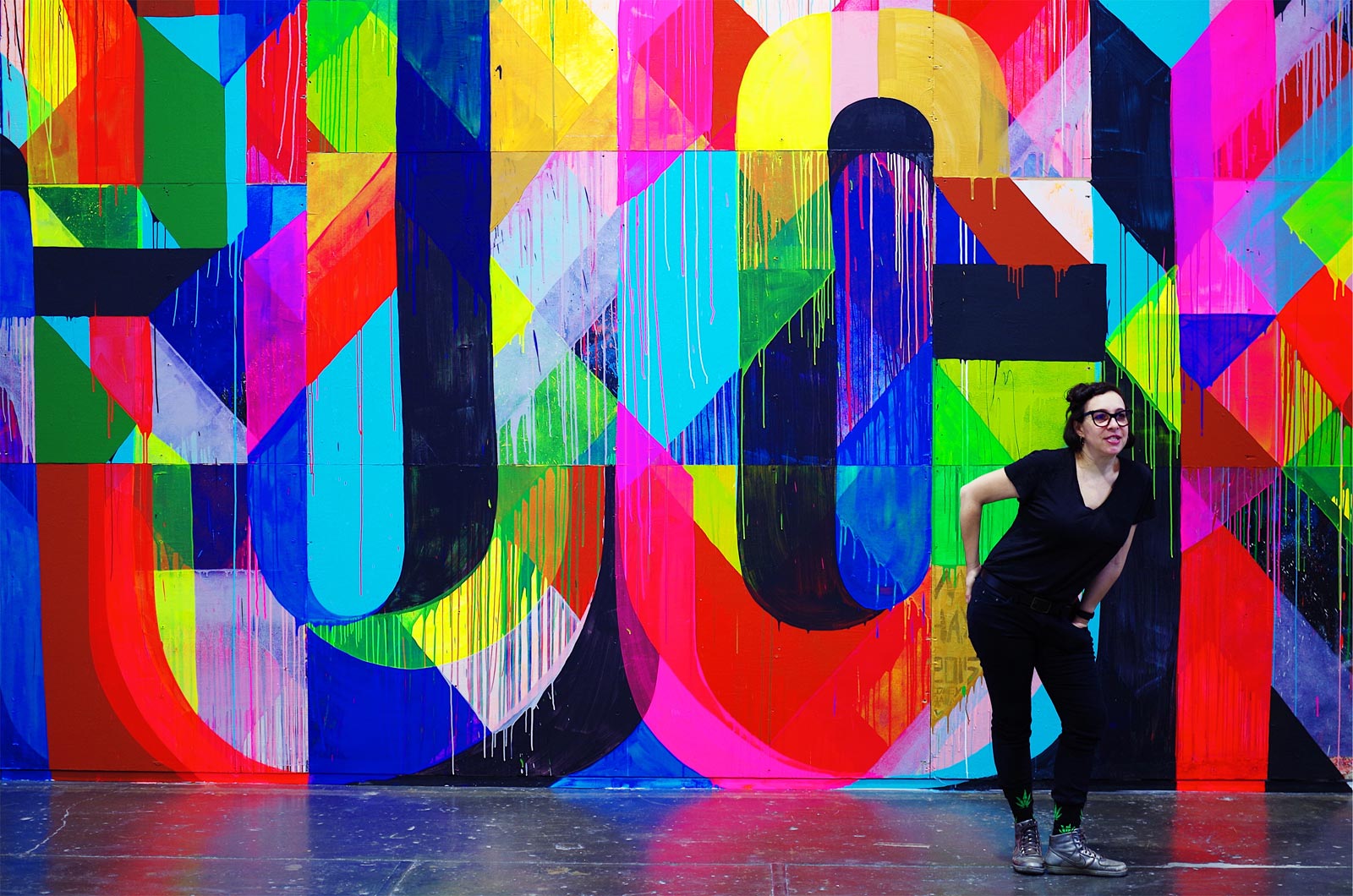 Then the show shifts, moving from more formal art spaces and practices to looser, enveloping areas that intend to wow. A three-story Takahashi Murakami mural-on-a-screen wraps onlookers, FAILE presents a captivating porcelain temple, DABSMYLA deliver a floral evolution of their work, before sending you to adidas Skateboarding and RISK’s stellar recreation of the iconic Venice Pavilion, a skatepark at the beach end of Los Angeles that attracted visitors and locals. This part of the show also brings out crossover artists whose work moved indoors, starting dialogues with contemporary art institutions. This includes artists like Cleon Peterson, Maya Hayuk, Ben Jones, Banksy, KATSU, and Jenny Holzer, among others. These works, like the entire show, include art brought into the space and art made in the space.