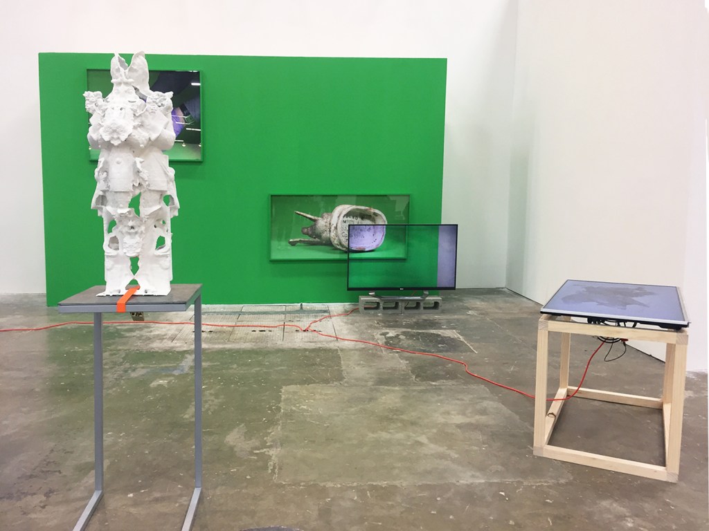 Seen at ArteCámara, Juan Covelli‘s mixed media work “How to dust the surface” (2017) incorporates LED panels, video, 3D-printed sculpture, and digitally printed vinyl. With a focus on composition, Covelli arranged objects in a manner that they may appear in digital space. It’s as if he was thinking about multiple open tabs and made an environment that could be flattened, but instead can be walked through. Delving into the realm of post-internet fantasy, the multimedia installation offered an elevated scenario that was unexpected—and reminded viewers of a theatrical set begging for participation.