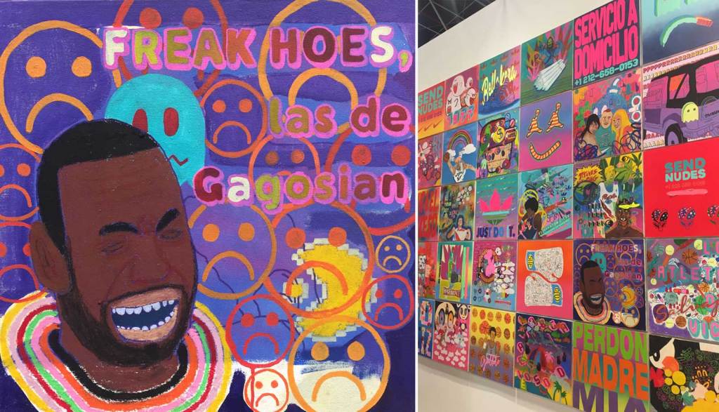 Painter Hector Madera looks to memes, buzzwords, hashtags and other symbols of popular culture and translates them through his bold artworks. An installation of his square-shaped canvases filled a wall in the booth of SGR Galeria, Bogotá. Colorful and almost in the vain of comic book illustration, the paintings’ humor was a light in the context of an art fair—poking fun of the very environment it hoped to be part of.