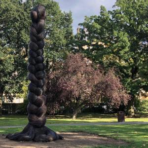 All four of these Tools of Endearment works look to what that the artist refers to as requirements for femininity in a contemporary world that’s unwelcoming to the bodies of their wearers. “The Plait,” which rises 22 feet up, “is a feminine sensual symbol made of hundreds of intertwined thin rods that rises ambitiously toward the sky as if just by standing upright is making its own statement of self-worth and defiance.”