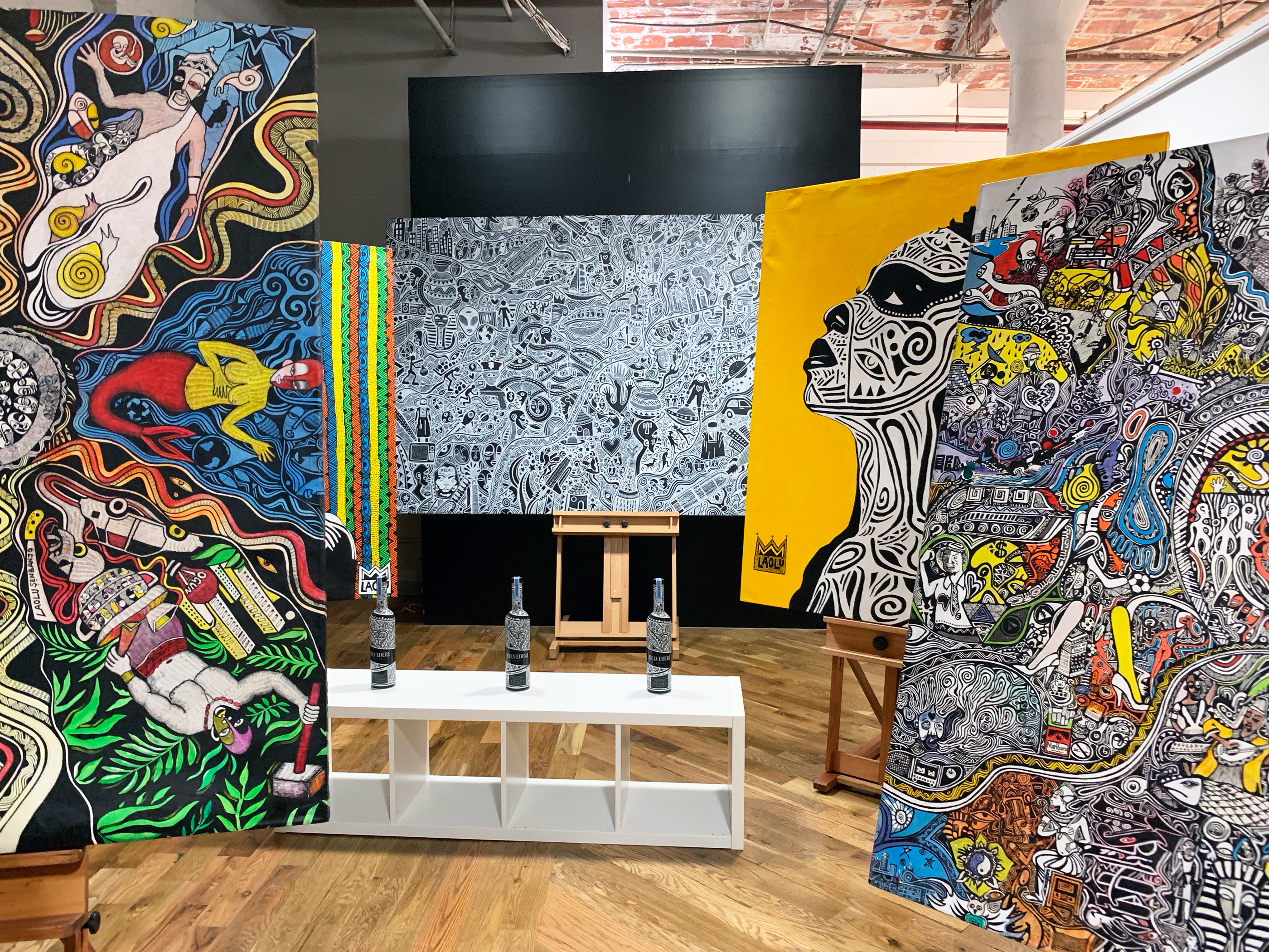 Laolu’s latest happens to be a Belvedere bottle—and it’s more than an example of a brand tapping a forward-thinking artist. “Back in Nigeria, people were screaming ‘Whoa, that’s our bottle,'” he says about the reaction. “This was my dream—two, three or four years ago—to bring Yoruba art to the forefront. When Belvedere embraced that, it got to the whole world. He notes that they gave him enough room on the bottle—and took out the palace and the trees—in order for him to wrap up his art as he pleased. Further, it was produced in collaboration with (RED), meaning it literally gives back to people in Nigeria.