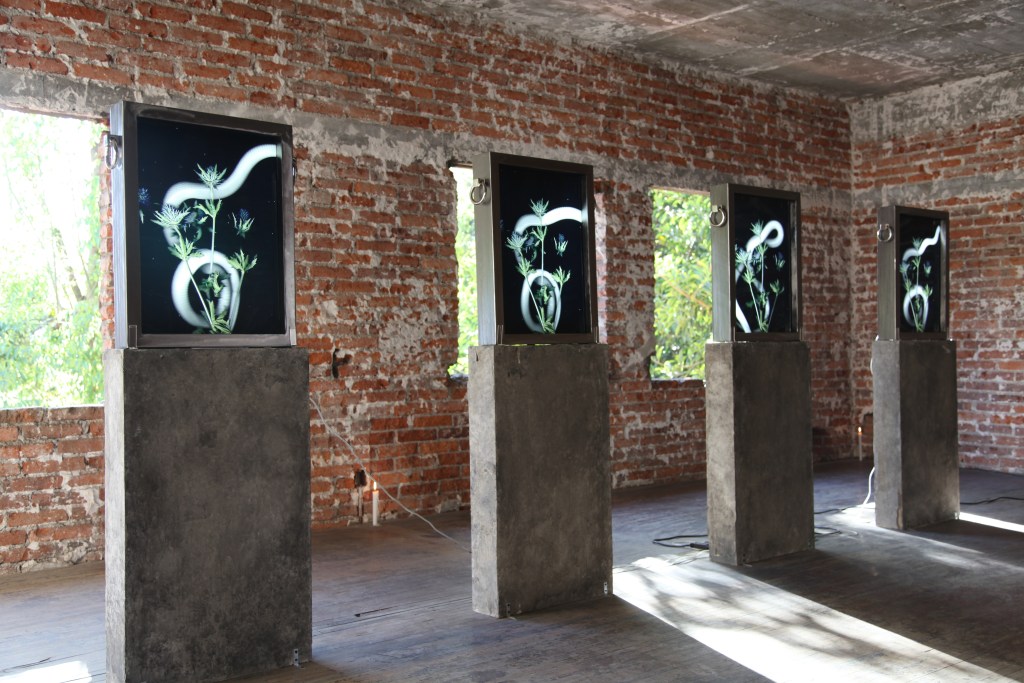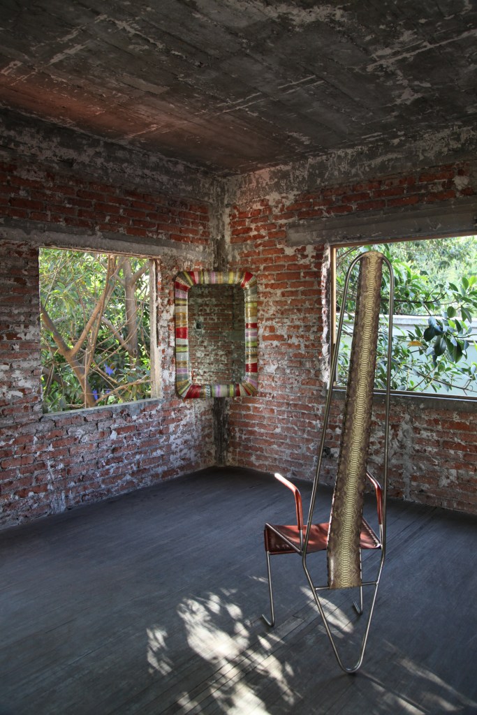 In several rooms across three floors of an abandoned brick building, behind a small market in Mexico City, photographer and multidisciplinary artist Pandora Graessl‘s mythic exhibition, Amor Fati: When the Fire Bit Me, transports guests by way of serpentine photographic and sculptural works. The immersive installation—which plays with light and color, texture and material—contrasts several metaphoric pieces with their surprising surroundings. While the unexpected exhibition aligned with the Zona Maco art fair, it will continue to run through 20 February.