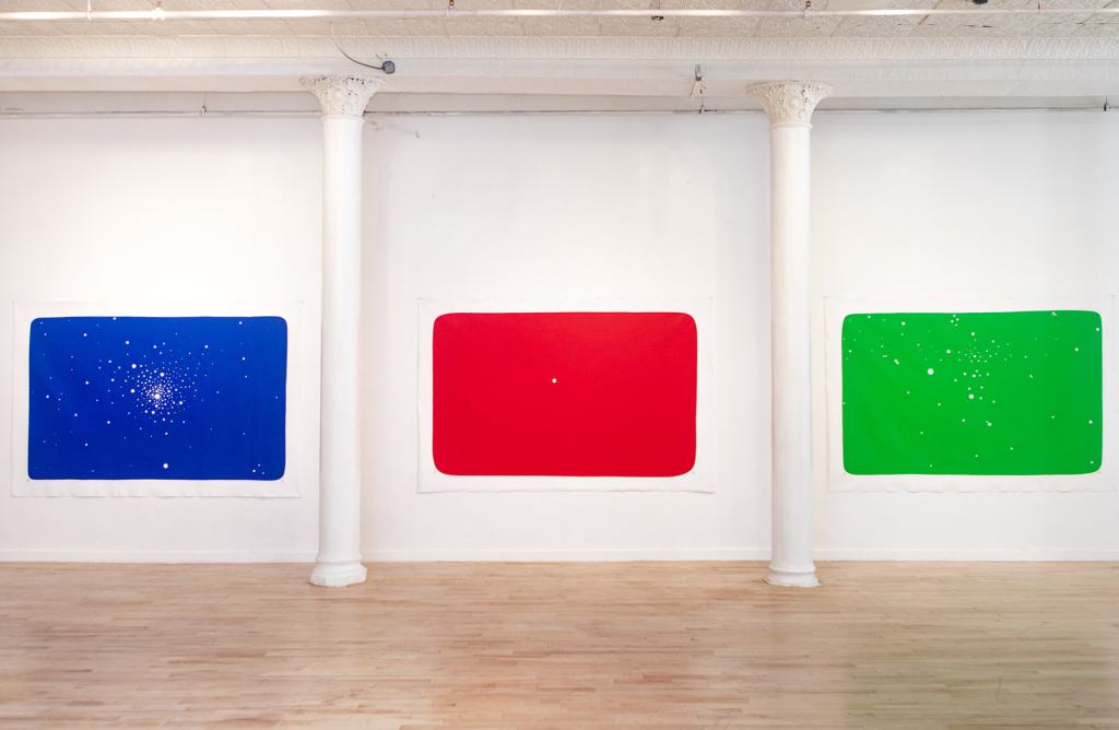 For the more recent show, Rebirth (with imagery throughout the article body), Silva says, “The intention of my series is to create an experience. The first step was to prepare the canvases by plastering and painting the layers of colors. There are maybe 10 or 15 layers of acrylic paint on each.” This system lends each colorful work a particular vibrancy that pops from the wall. “Then I positioned them in the room and chose the Stravinsky ballet Petrushka—because in it there is this puppet and I wanted my body to be a puppet to the colors.” To the music, Silva then painted the dots within several of the works. He began by painting with his finger, creating tiny circles, and then cycles of larger additions. These images feel cosmic—there’s a compelling outer-spaciousness that captures the gaze.
