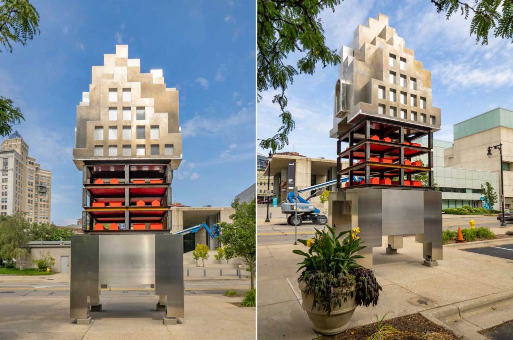 Olalekan Jeyifous contributes a totem of sorts across from Rosa Parks Circle. The work emulates a skyscraper and, upon closer inspection, is broken down into three sections referencing the housing crisis and racial discrimination in Grand Rapids. While the work has a sturdy and strong presence, the message remains hidden at first glance—provoking the viewer to look and think a little deeper.