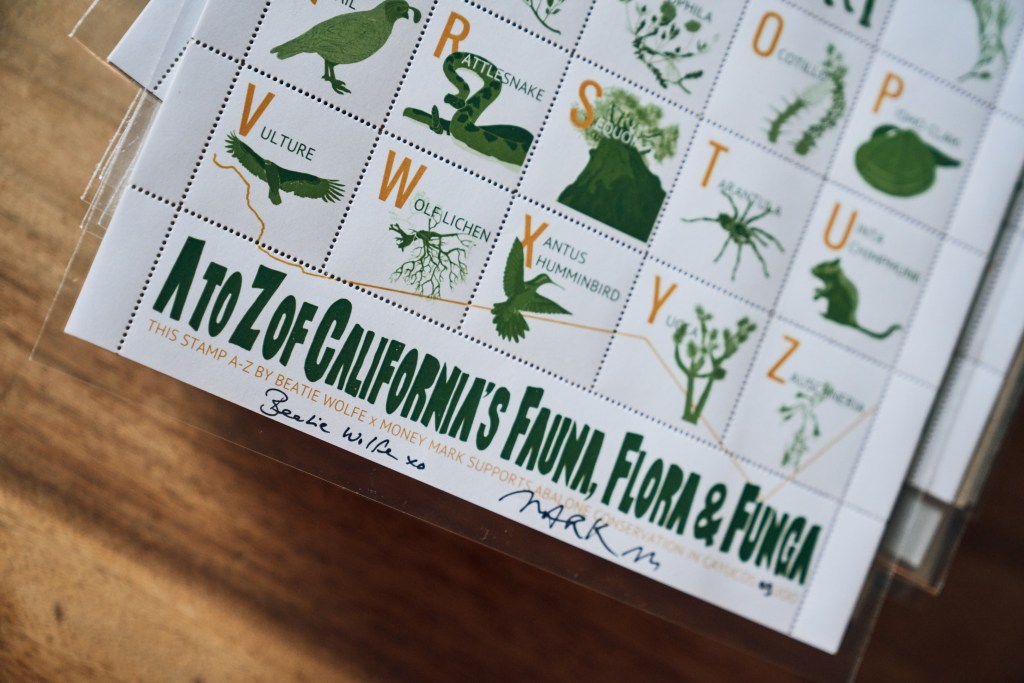 Visionary artist Beatie Wolfe and acclaimed producer and musician Money Mark (best known for his collaboration with the Beastie Boys) have partnered on a limited edition A-Z of California Flora, Fauna and Funga stamp-sheet and poster. All 26 letters of the alphabet correspond to an image of wildlife native to the Golden State, from abalone, black bear and chanterelle to the xantus hummingbird, yucca and Zauschneria wildflower.