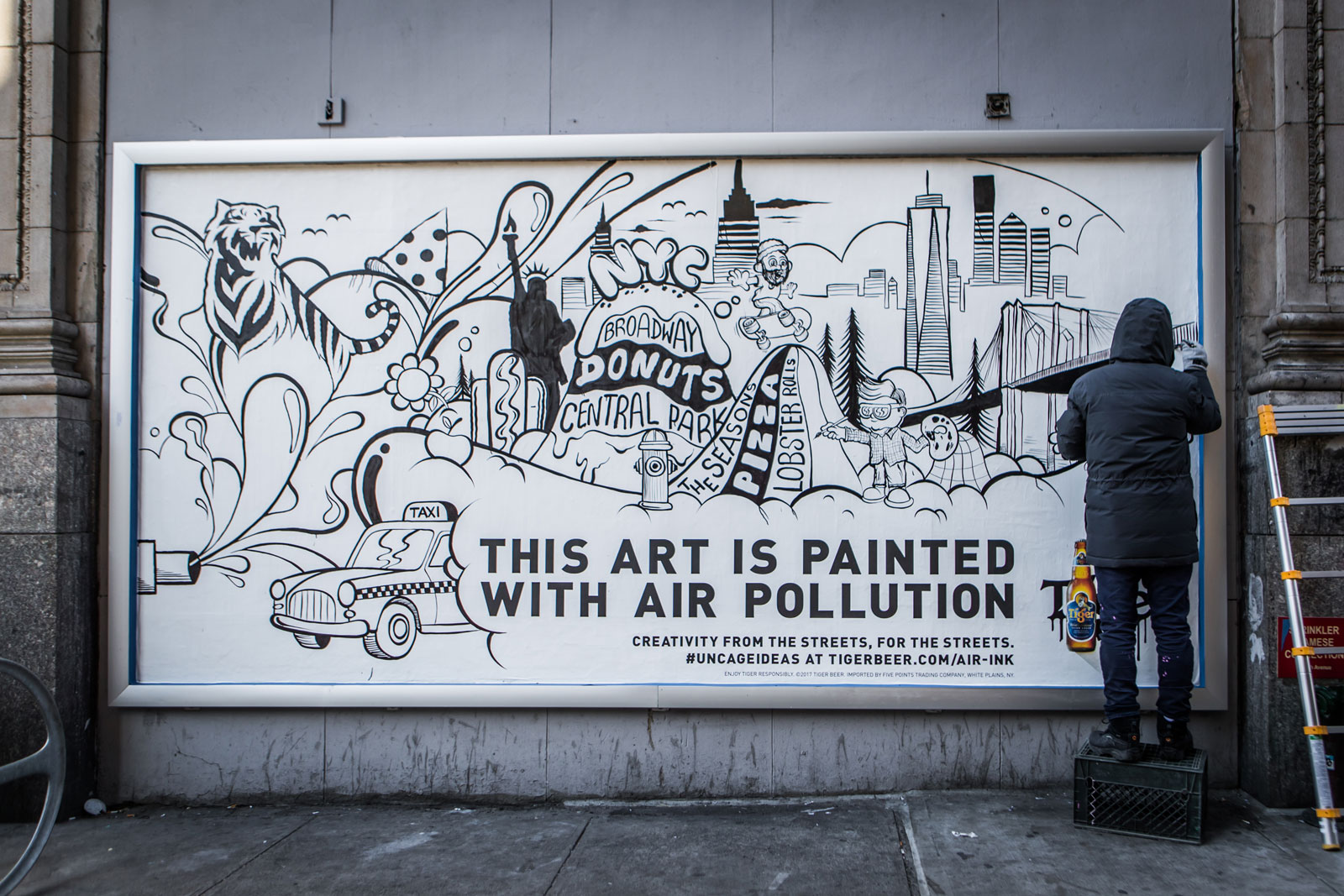 It seems almost impossible: ink and paint made from recycled air pollution. In fact, it’s a reality known as Air-Ink, invented by Anirudh Sharma, the co-founder of innovation hub Graviky Labs. Their technology processes up to 95% of air captured from vehicles into safe-to-use ink and paint. To date, they’ve cleaned 1.6 trillion liters of air and produced 203 US gallons of Air-Ink. And thanks to Asian premium lager Tiger Beer, the service and its output are about to get even more attention. Back in 2016, Tiger Beer launched an Air-Ink awareness initiative in Hong Kong, where they employed a team of emerging artists to create public work with the material. This program has now extended globally and today in NYC, the brand has unveiled phase one of their work with street artist Buff Monster. At the northeast corner of 28th and Seventh in Manhattan, a Buff Monster Air-Ink mural is visible for all to see. On 21 April, a “Clean Art Gallery” will open at Senaspace in SoHo, displaying even more Buff Monster Air-Ink work. With so many important moving parts, we spoke to Sharma, Buff Monster and Chas Littefield from Tiger Beer parent company Heineken on what came together to make this a possibility.