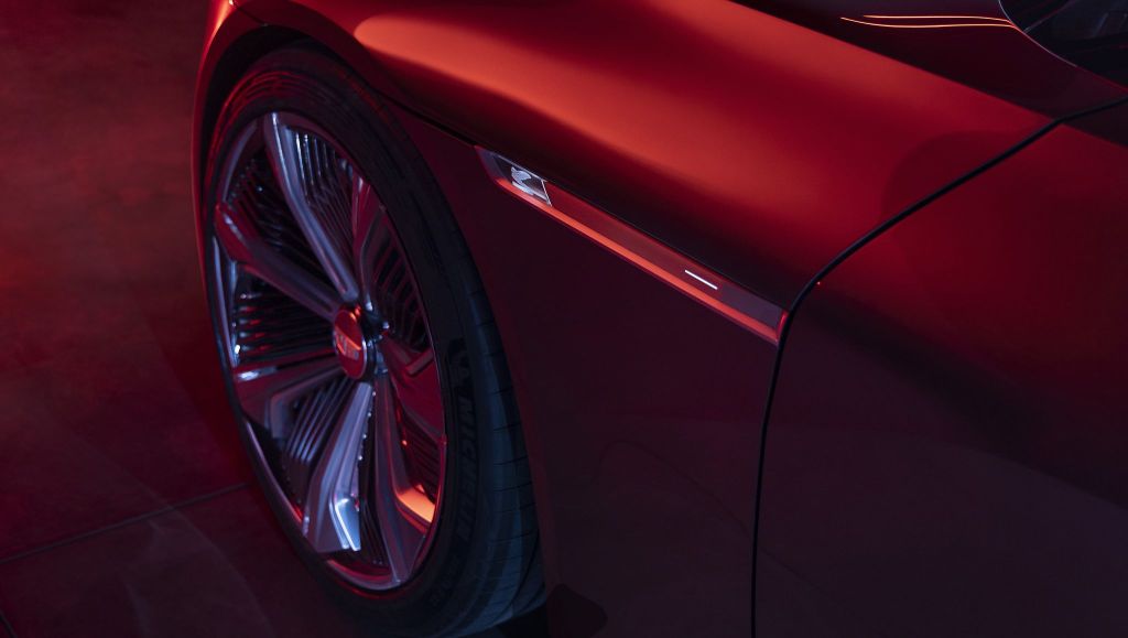 Debellis adds, “We wanted to really rethink what will be the next icon for the brand, in parallel with the recommitment of the company to shift for a full electric portfolio. It was really ideal for us with the freedom of the new electric platform to come up with a proportion that’s very distinctive, very iconic, very unique.” The long dash to axle line only adds to the dramatic appearance. While the team didn’t want to create a car that was similar to anything else on the market, they did look to Cadillac’s own history—specifically the 1950s, when they looked at architecture. Additionally, there are contemporary haute couture fashion influences.
