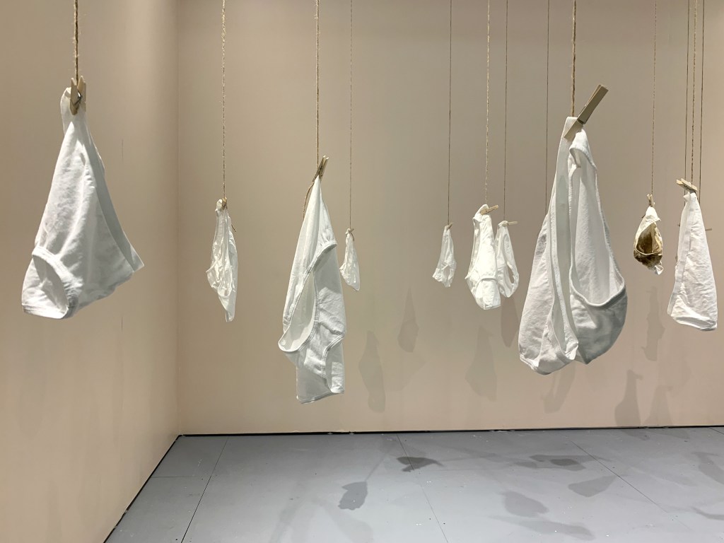 As part of Pulse Art Fair‘s Pulse Projects, Ann Lewis’ “One in Five of Us” (2016) installation incorporates women’s and girls’ underwear that’s been soiled with beer and blood, dirt and tears. Lewis suspends the garments with wood, metal and twine, directly in one’s line of sight. This bleak image works as a reminder that 20% of American women are raped in their lifetime.