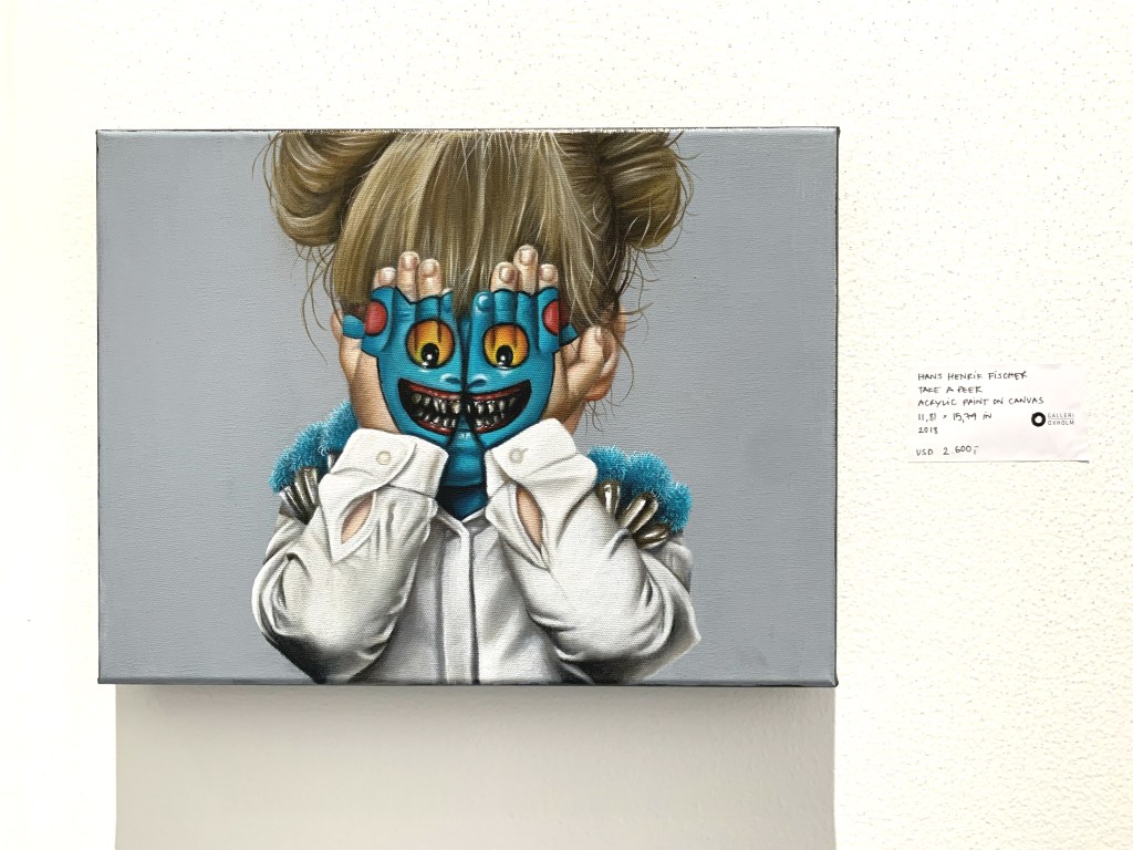 Another highlight from Scope, Hans Henrik Fischer’s “Take a Peek” (2018) acrylic paint on canvas work addresses the old fear of fictional monsters. Fischer’s figuration and framing positions a young girl front and center with two manifestations of beastial fear directly on her. It was seen at Galleri Oxholm‘s booth.