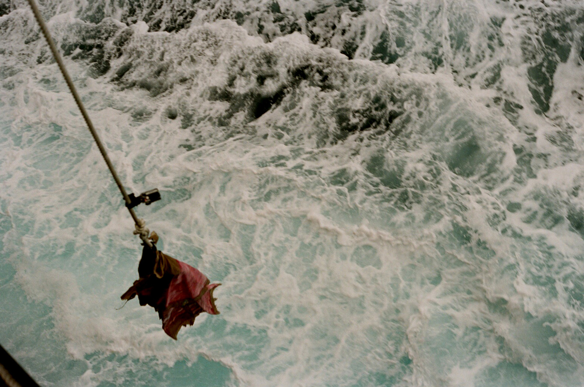 Sternberg explains the first obstacles arrived well before he boarded the ship. Setting up such an experience “was a tricky process,” he notes. “The amount of ‘freedom’ I was asking for in my creative process required a shipping company, vessel and crew that understood my mission and desires and supported them to a high degree.” His journey was rescheduled multiple times, but found an ideal patron in A.O. Shipping. “They allowed me to travel on the maiden voyage of the ship, to bring a crew of three and shoot a documentary about the journey and provided me with access to every corner of the ship.” Sternberg’s watercolor works carry the chaos of all of the above—and in their own way, they carry more than salt spray, but also the story of a unique voyage.