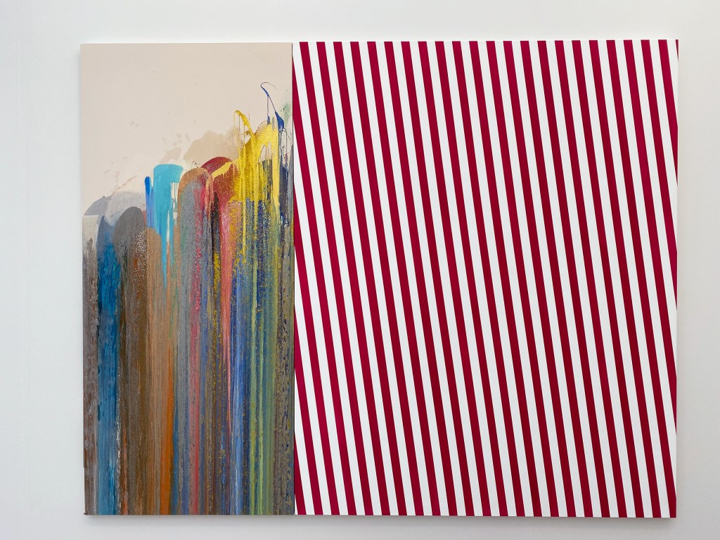 Within the walls of Frieze, NYC‘s Almine Rech gallery presented “Calcareus Sponge” (2016) by Swiss artist John M Armleder. The mixed-media work on canvas appears to represent two concepts at play, striking one another cleanly.