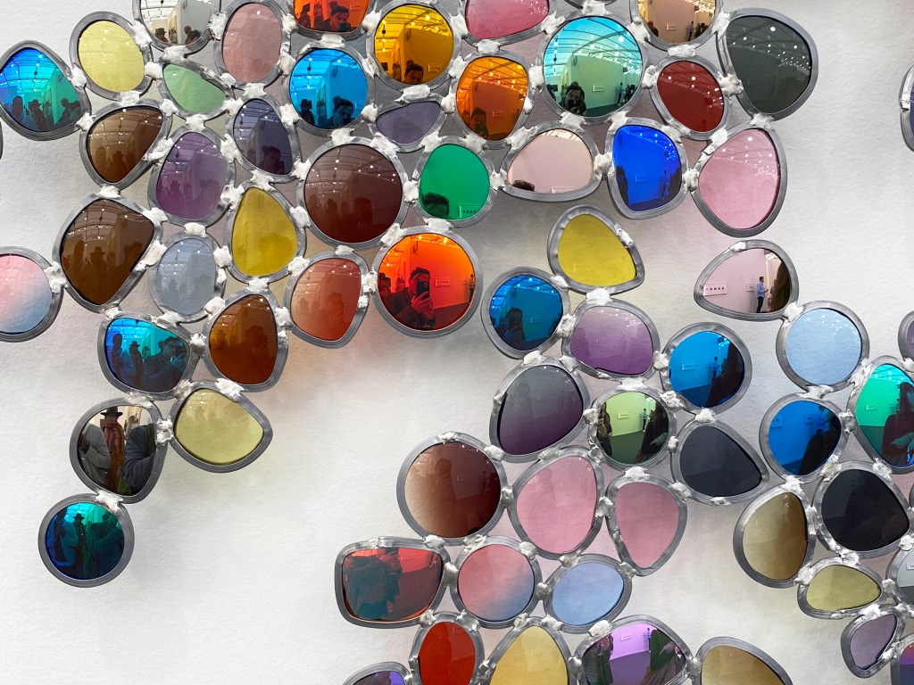Everyone who passed Jim Lambie‘s “Higher Than The Sun” (2020), at Glasgow’s The Modern Institute/Toby Webster Ltd installation with Frieze, understood that the work was composed of sunglass lenses. Spiraling out, the wall-hung sculpture played with light and utilized the contrast of its individual components.
