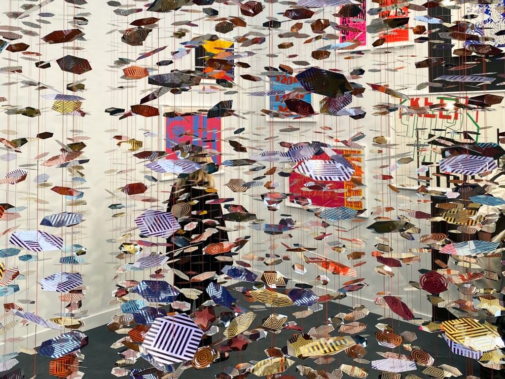 Awhirl with color, Milan/NYC gallery Kaufmann Repetto‘s Frieze booth featured a globe-shaped mobile of strung components—2743 silk screened, electroplated steel discs upon 164 threads. This mesmerizing piece, “Half Magic” (2020) by LA-based Pae White, complemented the numerous Corita Kent works on the wall. The colorful conflict and cohesion of the booth captivated passersby.