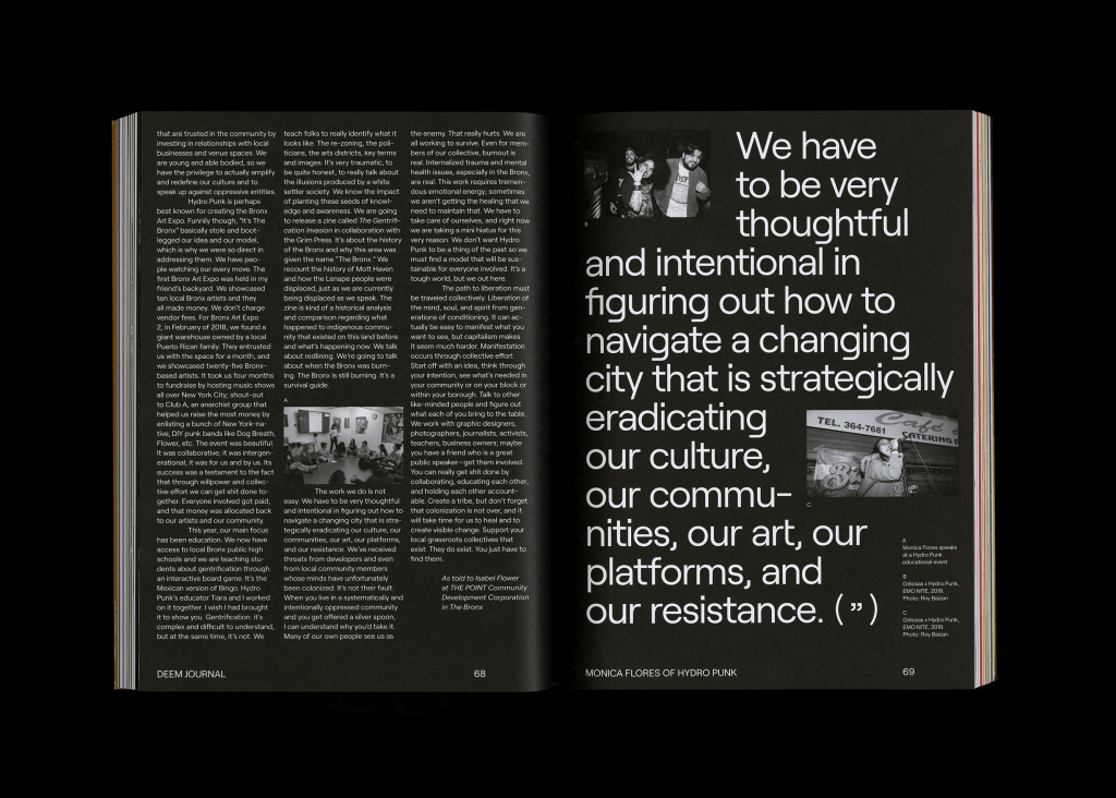 MS: Absolutely. In many ways we’re hoping that Deem, as a journal, is not a quick read, but a place people can continue to come back to. We may have had to label this issue one just so that everyone understands that there’s some sequencing but, to be honest with you, there’s really no sequencing. We’re hoping that after a while we’ll have a library of journals that people can continue to go back to as a resource—something that’s outside the traditional practitioner space. That it serves as a resource to remind, to inform, to engage, to continue to push their curiosity and allow us all to see a better future.
