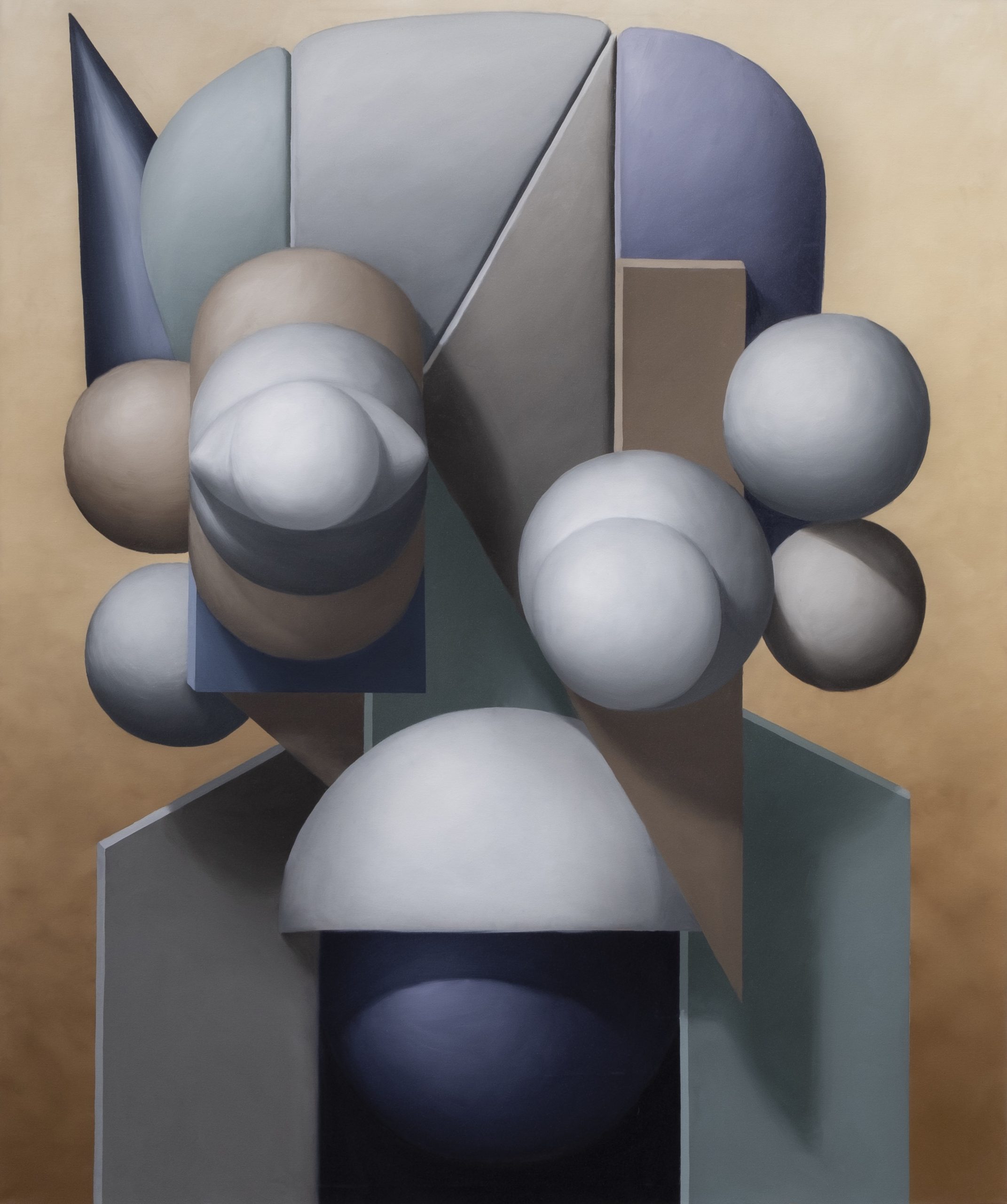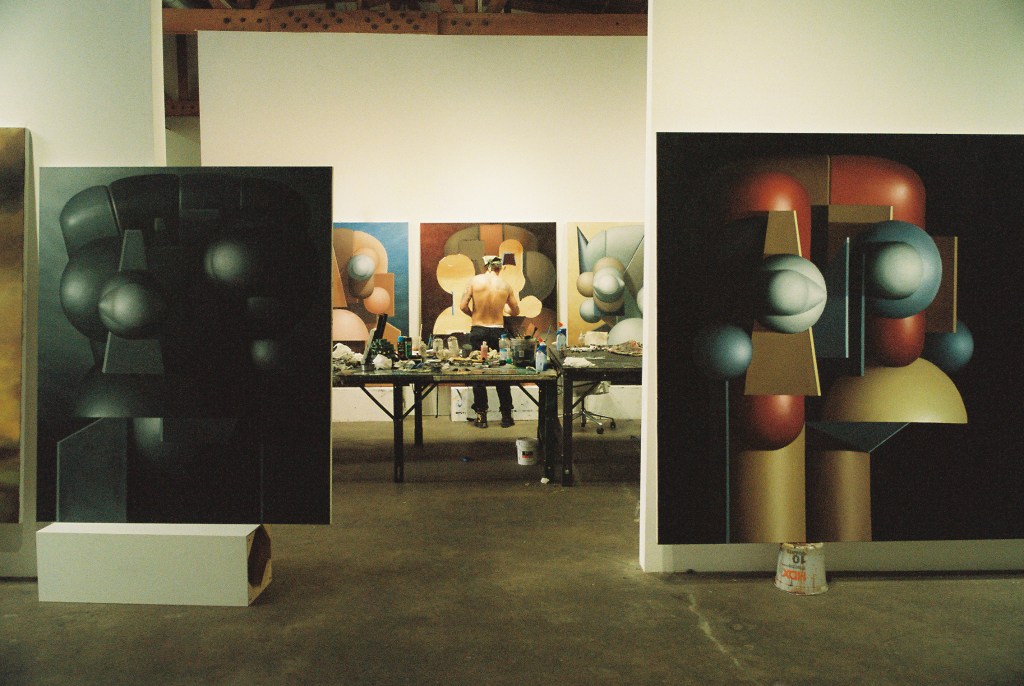 While clean, layered geometry might afford the paintings modern sensibilities, DeJardin turned to old-school techniques for oil painting, getting more technical with this exhibit than any previous. He starts with a loose sketch that he’ll do on any paper on hand be it napkins or scraps. Then, he moves to a small form study of oil on paper and once the colors and layout are right, he transfers them onto the computer to manipulate color and modes of painting. Once he has the right components, he prints out the sketch to use as a rough draft to start painting the canvas. The process takes months to complete for each piece.