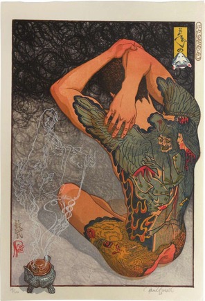 The tone of the exhibition is set from the start with a stenciled graffiti installation by Lady Aiko, a Japanese-born street artist who currently resides in Brooklyn. The mural breathes life into the sterile gallery with an image centered around a woman with a back tattoo sitting in the shadow of a wave. Aiko welcomed the opportunity to be part of Japan Society’s exhibition, saying, “When they asked me to be part of Edo Pop, I thought, “I’m already Edo Pop—I’m already doing ukiyo-e.”