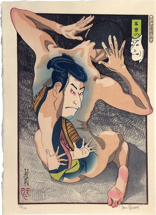 Following Aiko’s mural, the show is divided into four thematic stages—beauty, actors, joy of life and landscapes. The first section presents the bijinga (literally, “beautiful lady photos”) of the monumental figure Kitagawa Utamaro, who is known for bringing expression and dynamism to classic geisha portraiture. Paul Binnie, a Scottish painter who turned to traditional wood-block prints, makes an unlikely pairing for Utamaro. Binnie expands the bijinga legacy by depicting male nudes and heightening the color range.