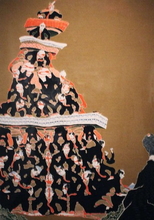 “Tokyo Tower” by Ishii Tōru riffs off landscapes of Mount Fuji, showing a pile of businessmen with faces painted in kabuki style. The hilarious commentary on corporate hierarchy is relevant down to the last detail, with yen signs replacing the eyes of the salarymen.