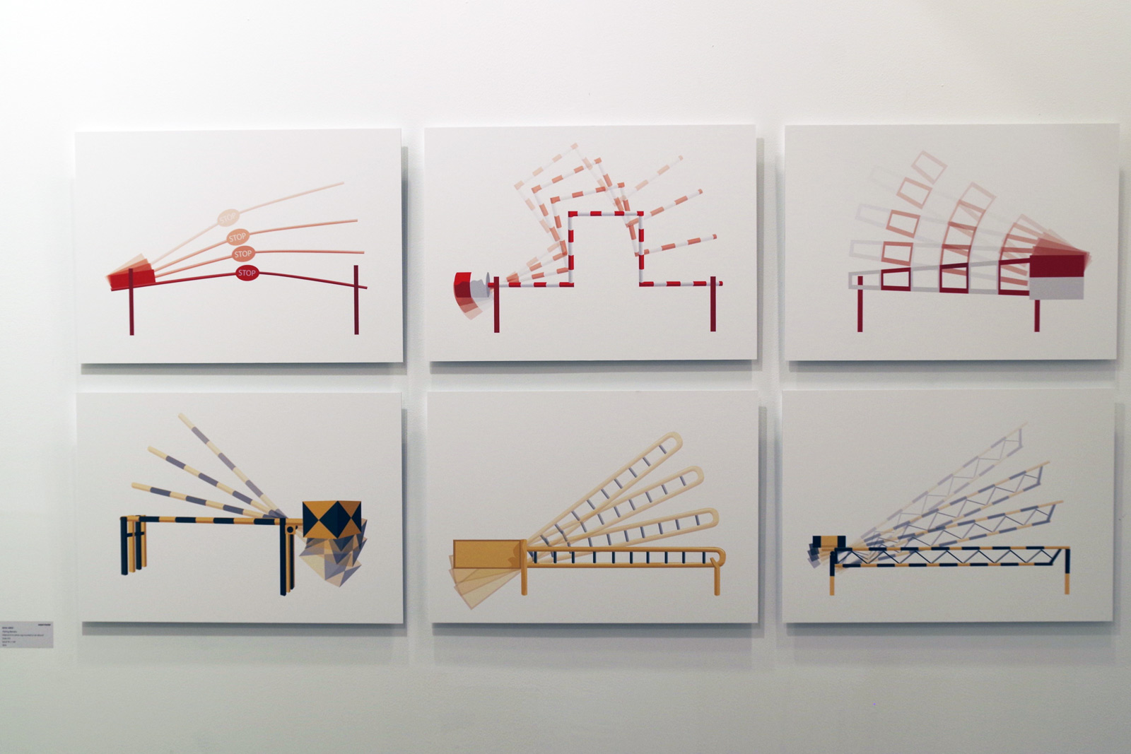 A series of six Inkjet prints on photo-rag mounted atop Alu-Dibond, Bani Abidi‘s “Flailing Barriers.” The artist lives and works between Berlin and Karachi, Pakistan. Her works range from photographic pieces to performance and even video and frequently confront political, social and economic issues. With this series, she touches upon the idea of being stopped—and while the concept comes across as direct, there’s a likability to the work drawn from the use of color and shape.