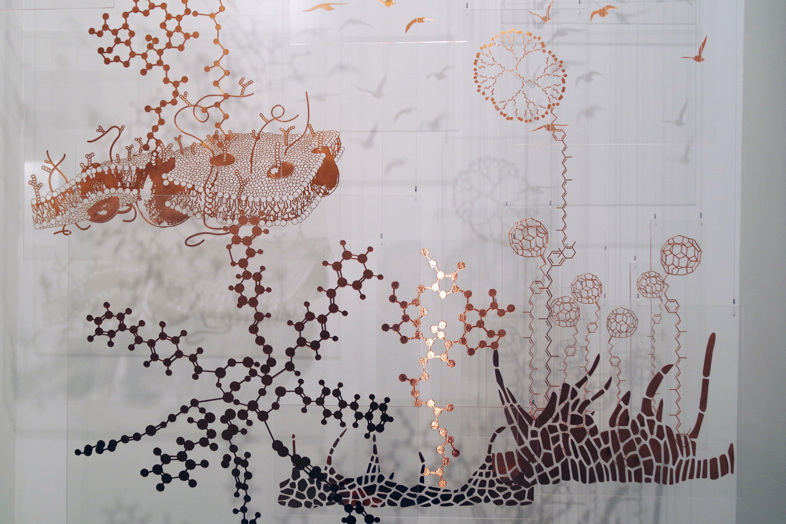 Based between New Zealand and Goa, Western India, new media artist Nandita Kumar‘s “216.22 hz” balances still items with video and sound. From the acrylic and copper structure to the moving images supporting them, the work engages with luster. An artist of many talents, Kumar’s accolades range from film scoring to community art project awards—and this work touches upon more than a little bit of what makes her engaging.