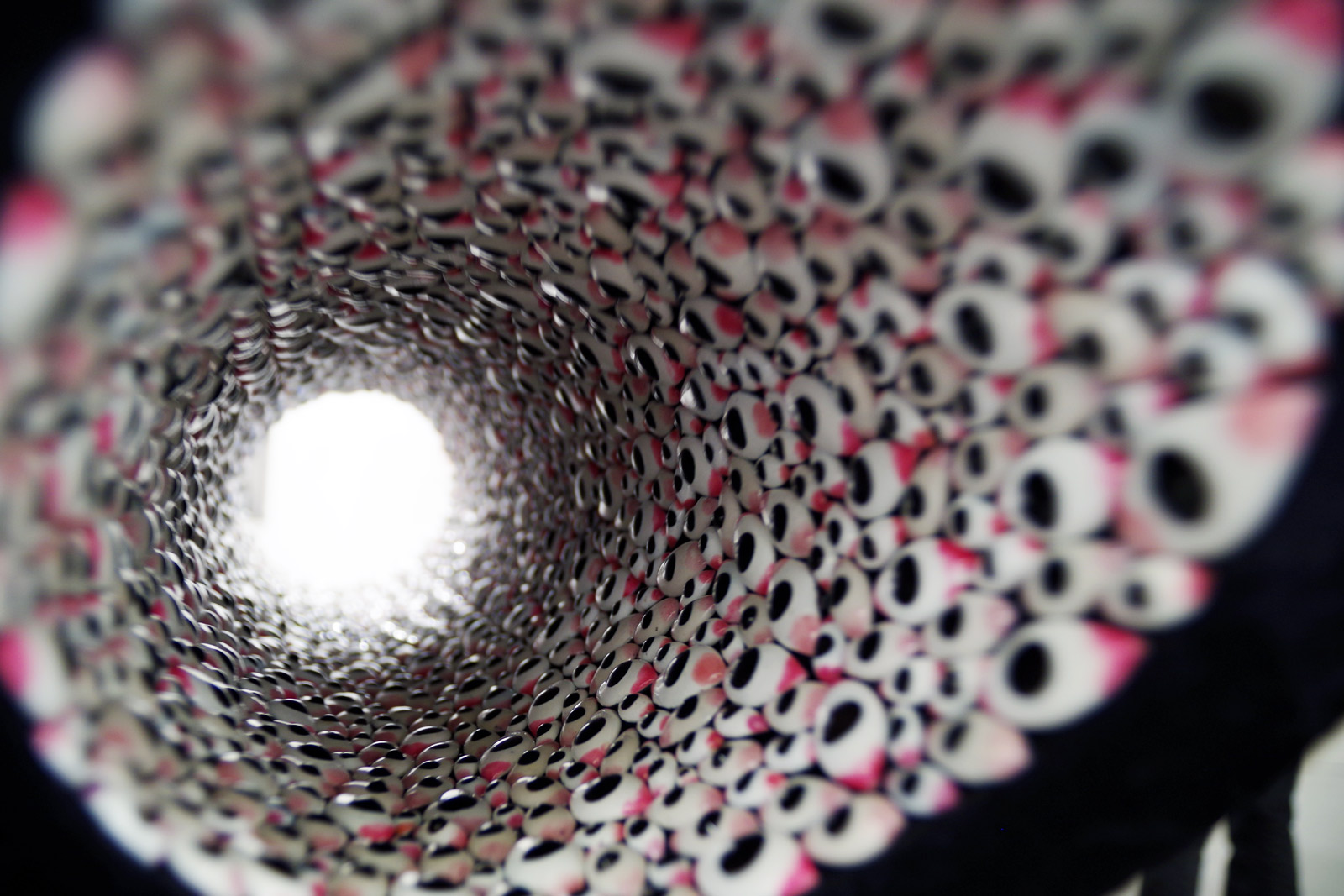 Representing an artery, and all that lays within, Anita Dube‘s sculpture “Veinous” cites enameled votive eyes as a noticeable source material. The eyes have been affixed to the inside of a PVC pipe, which in turn has been covered in velvet. When looking within, it does give the eerie impression of an artery—but one that guests want to touch. The New Delhi-based mixed media artist delivers a cerebral piece that manages to allure from an aesthetic standpoint while asking viewers to think a little deeper about her inspiration.