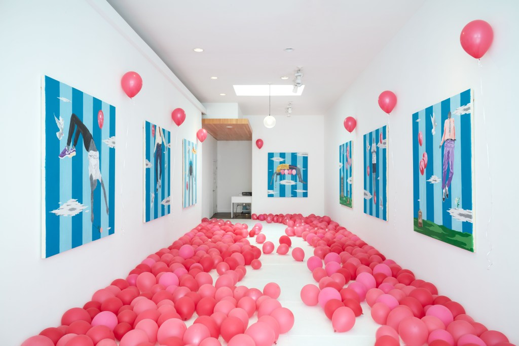 Nigerian artist Ameh Egwuh’s solo exhibition Life After Life (on display until 8 May) takes its name from psychiatrist Raymond Moody’s 1975 book, in which he interviewed people who had near-death experiences. Exploring life, death, rebirth and time, Egwuh’s paintings feature blue-striped backgrounds and pink balloons, but each features different symbols and figures. The artist planned the dreamlike exhibition to take place in a space also filled with pink balloons, which adds another surreal layer to the experience.
