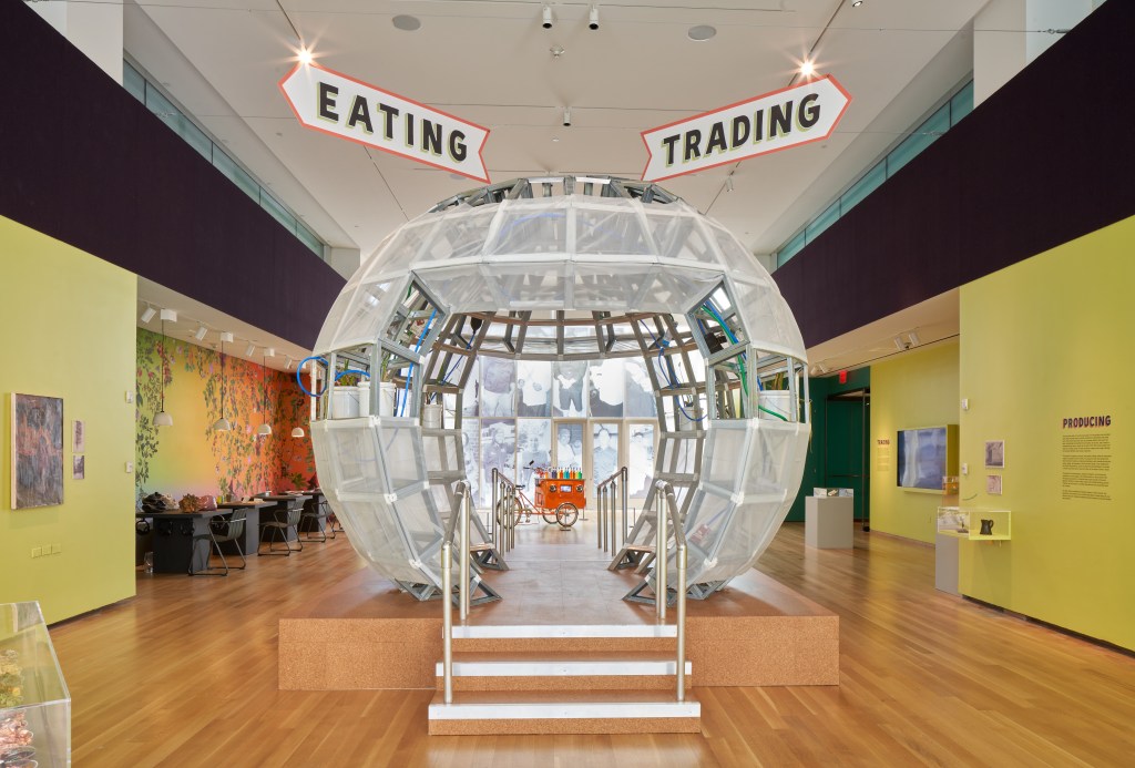Across the diverse works by 20+ contemporary artists, the show is organized into three parts: production, trading and eating. While these categories reveal the fragility and instability within growing, sourcing and serving meals, the show is by no means bleak. Instead, López explains, “It’s a very uplifting, colorful, vibrant show. We use that vibrancy and the colorfulness to drive home some of the solutions that are being proposed to the challenges that we have in the food system.”