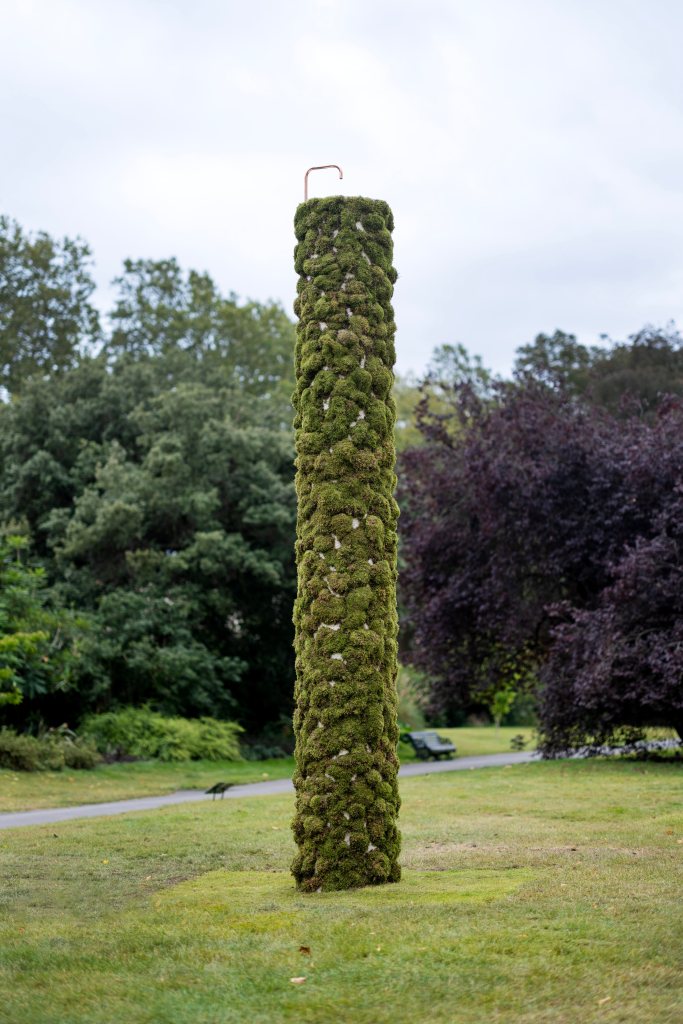 Ayşe Erkmen’s 2023 work Moss Column initially seems self-explanatory, but upon more thorough viewing there is more to the piece than what initially meets the eye. The five-meter tall column is composed of stone and etched in green moss, almost blending in with Regent’s Parks flora and fauna. At the top of the column lies a copper tube that gradually feeds the moss with water, causing the piece to develop more moss as the copper turns more and more green via oxidation. Part of this piece’s magic relies on the fact that it is constantly in flux, growing and changing in front of the audience’s eyes.