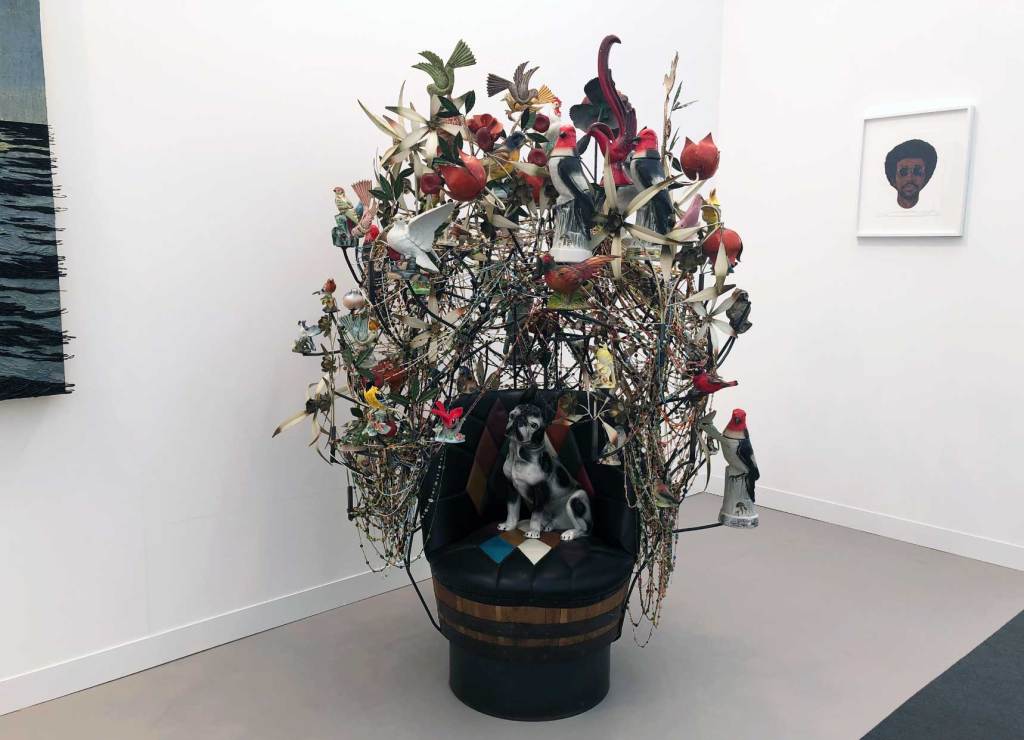 Shown by Jack Shainman, Nick Cave‘s Rescue series is comprised of sculptures that incorporate found ceramic dogs sitting on furniture within elaborate grottos and dreamlike dens. Cave focuses on a single canine that has quite literally been rescued from destruction, very much like an adopted pet. These dogs become the benevolent guardians of their glorious self-contained worlds, focusing on the forgotten and discarded.