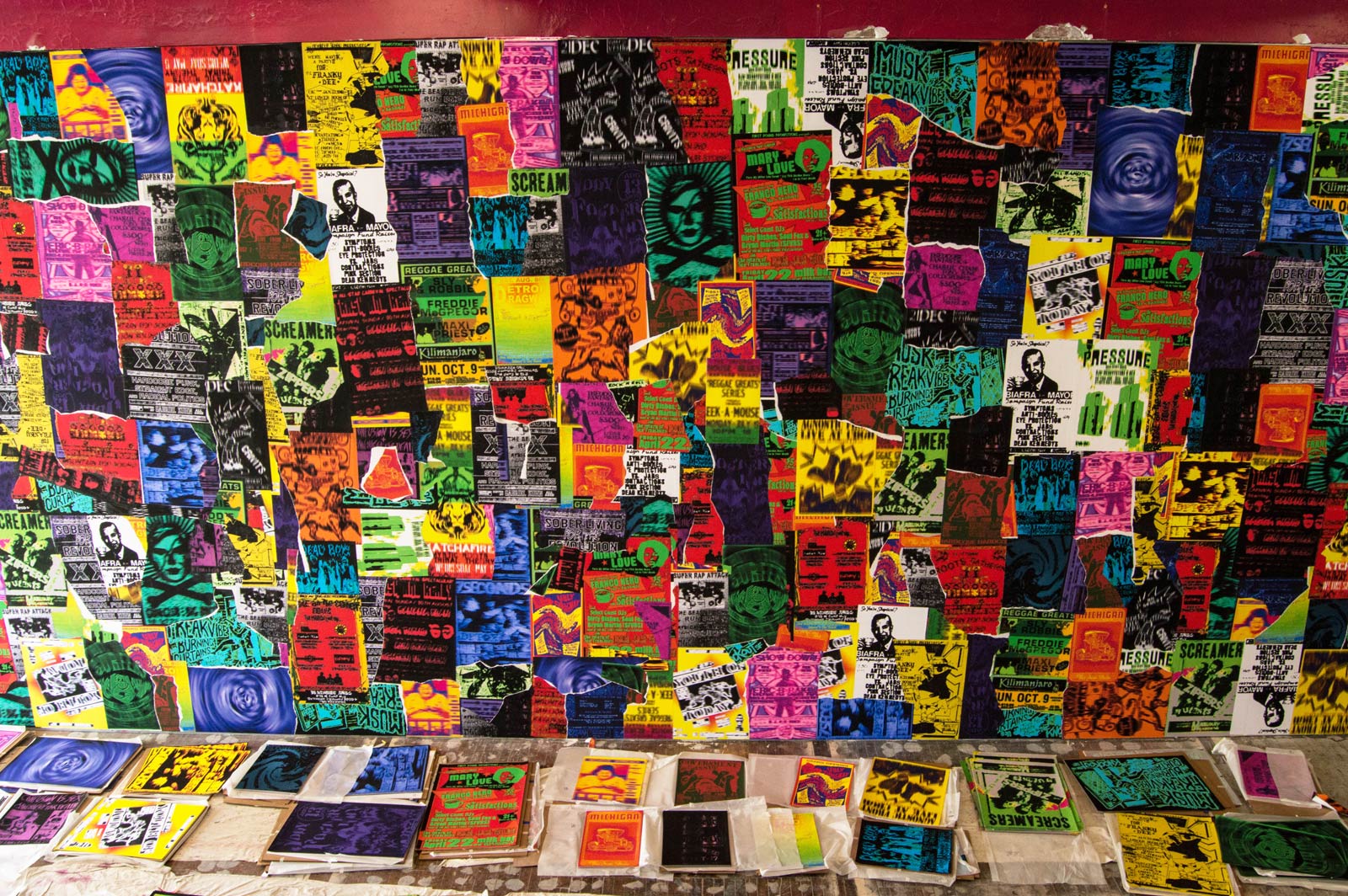 In addition to his previously shown fly-posters, Simmons developed 13 new ones for this exhibition. “As I get invited to different cities along the way, I kind of add in those new locations to the processit’s an additive process and exhibition.” Simmons collages and layers at each city location, and then tears them down only to get added on and layered at their next stop. For Detroit, he’s added many genres. “It’s visually sampling, in the way that music has long sampled from what came before it. They all kind of feed off of each other,” he says. He looked toward certain periods and withdrew relevant acts. He also blends in auto industry references, from biker culture to hot rods.