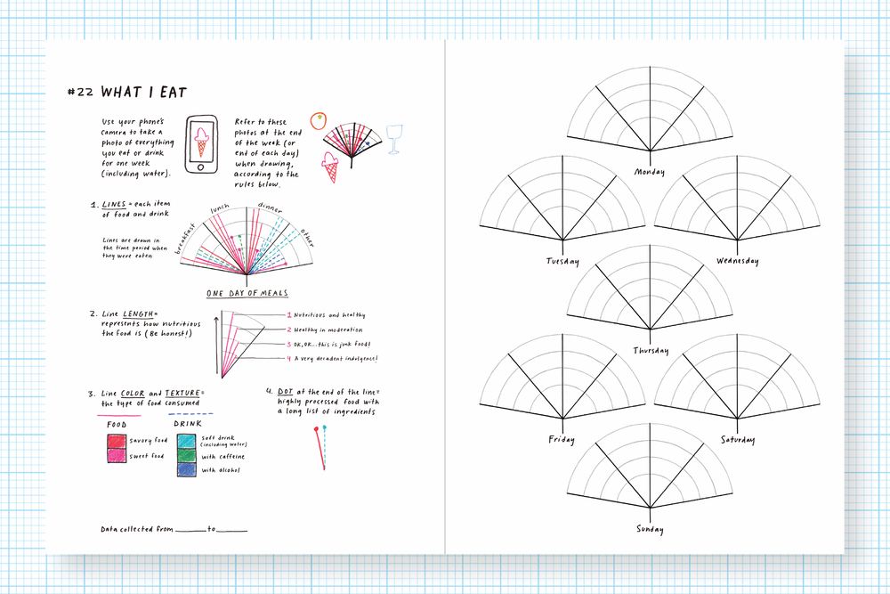Giorgia Lupi: This book’s not about us and our experience, but is a guide for people to start seeing their days and their activities in the form of data and then using the data they collect as a creative material for their creation. So the book is aimed at everyone who wants to learn more about themselves, slow down and pay attention to their days, who think of themselves as creative but don’t necessarily have the opportunity to feel creative on a daily basis.
