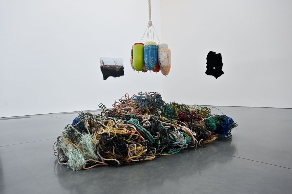 While James reframes objects to interrogate the collective’s relation to the personal, Karyn Olivier situates objects in their political and environmental context. For the exhibit, she presents a series of photographic prints encased in asphalt or roofing tar, as well as the large-scale sculpture “How Many Ways You Can Disappear” (2021). The foreboding title gives way to 13 feet of salt-casted pot warp (lobster fishing rope) recovered from Matinicus Isle in Maine. The rope is tangled underneath fluorescent green, blue and pink marbled buoys that hang from a clean white rope. Here, the limp, functionless rope bring its salt remnants to the forefront. “I was thinking of salt’s history in relation to trade/currency, particularly the practice of trading slaves for salt in Ancient Greece,” says Olivier. In depicting everyday objects as what is left of them, the artists analyzes how history is distorted, forgotten and retold to fit personal narratives.