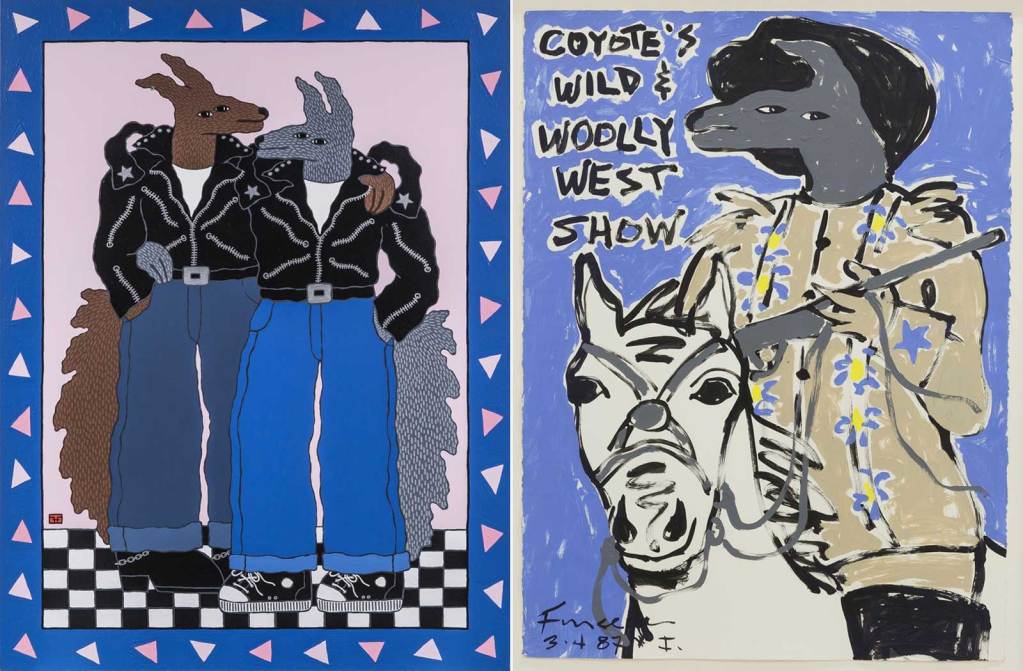 The exhibition also features paintings of Coyote with Rose—a flamboyant female coyote friend—along with depictions drawn of “Cowboys and Indians” tropes, as well as St Francis, a Christian figure the artist used as a way to critique and amplify the devastation caused by the mission system on native Californians.