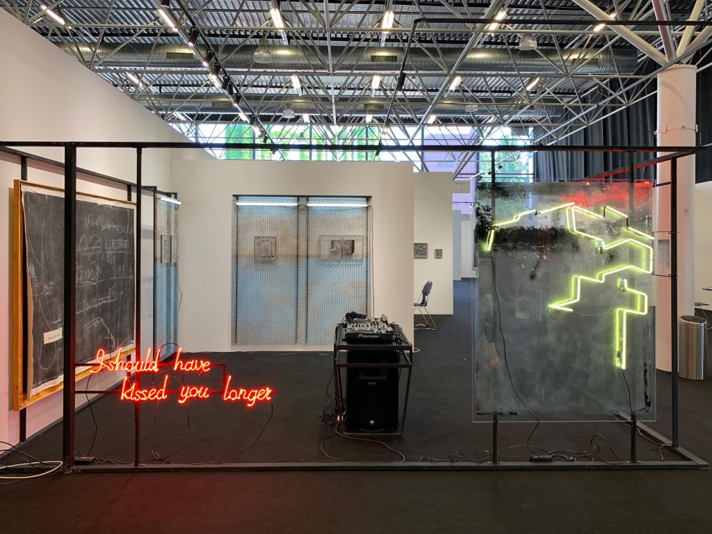 A multimedia, mixed material onslaught from the Erti Gallery booth is imagined and installed by Georgia-born, New York-based artist Levan Mindiashvili. From neon word art in both English and Georgian script to modified text on a chalkboard, Mindiashvili’s art manipulates the familiar in order to probe deeper—altogether, here, building an immersive stage. Known as “I Should Have Kissed You Longer,” the installation incorporates a central sound-system and songs by Georgian DJ and producer Sophia Saze.