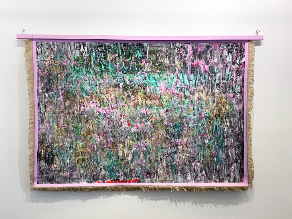 Presented by the exquisite Tbilisi-based LC Queisser Gallery, American artist Lisa Alvarado‘s “Traditional Object 28” (2018) finds feathers and acrylic paint affixed to fabric and wood. The mesmerizing layers of color and material yield a fractured peacock-sheen. The painted piece reveals more and more upon repeat glances.