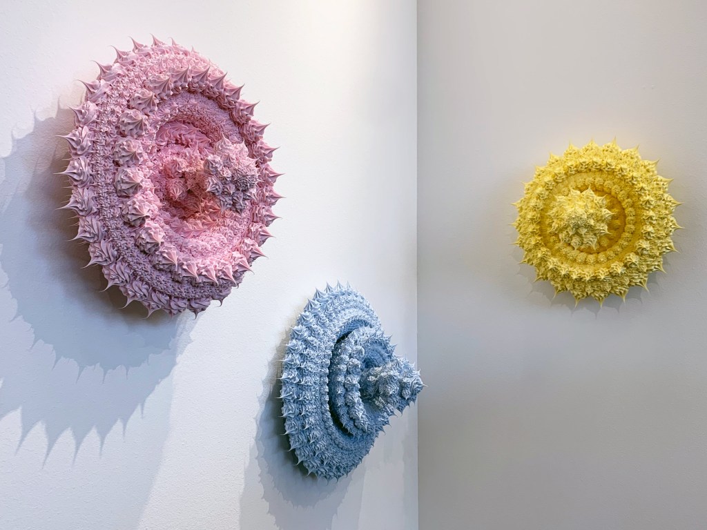 Wall-hung but with a wedding cake-like structure, Anke Eilergerhard‘s “Crown of Georgia” pieces feature layers upon layer of pigmented silicone. The German artist’s pieces were on show at Lucerne, Switzerland gallery AB43 Contemporary’s installation. From the delicate colors to the delectable shapes, there was something almost mouth-watering to the sculptures.