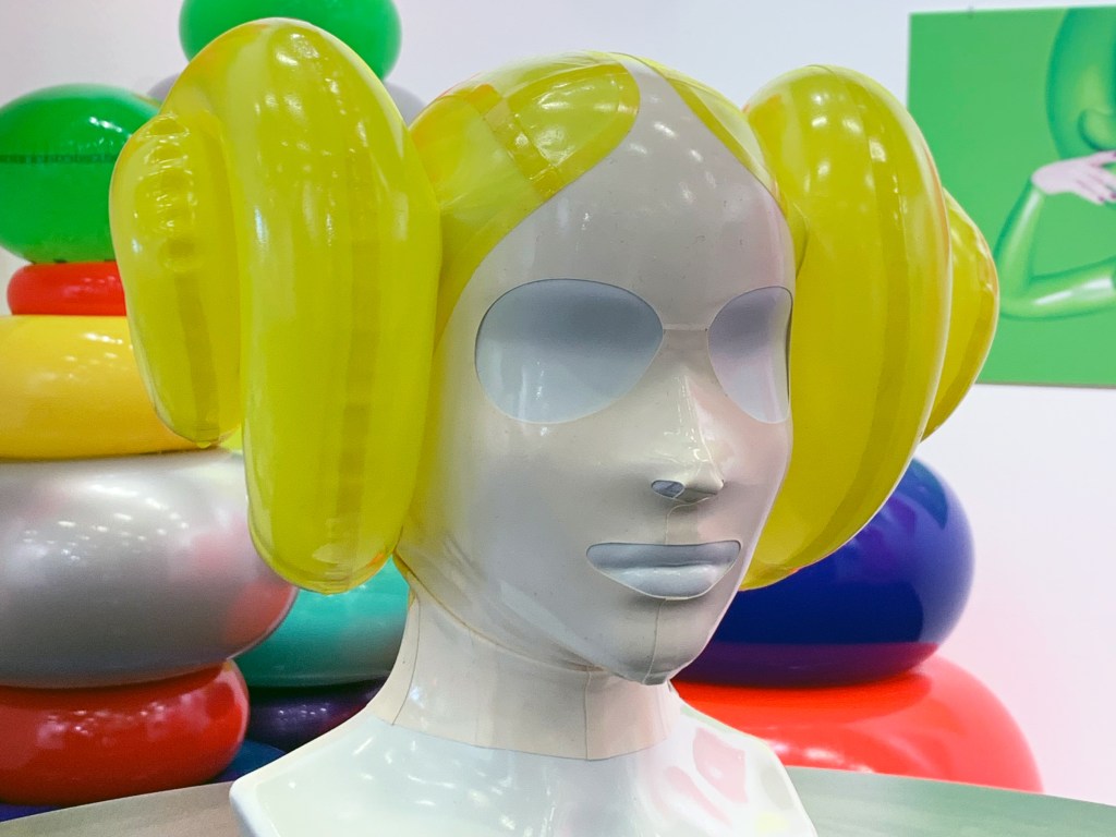 Russian artist Sasha Frolova‘s layered latex pieces populated Tbilisi-based Ria Keburia Foundation‘s entire booth. With playful colors and swirling shapes, Frolova taps into silliness, wonder and eccentricity. Her ” Leia Mask” (2016) is wearable art and falls in line with several body suits and latex wigs Frolova has imagined.