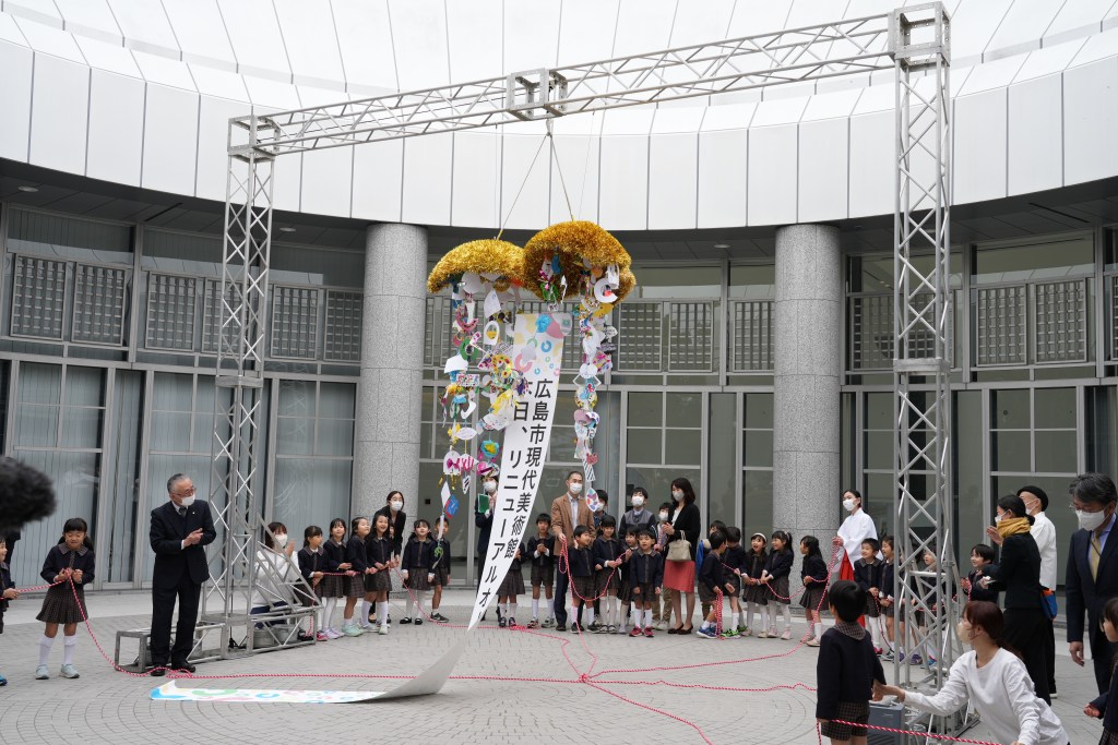 On a recent spring morning, a classroom of kindergartners in their school uniforms stood under a “kusudama” celebration ball with local officials and the director of Hiroshima MOCA. Together they pulled the long ribbons that opened the golden ornament, revealing decorations and congratulatory messages. The museum staff stood alongside, joined by a miko from the closest Shinto shrine and the workers of a neighborhood supermarket, sending a clear message that this significant cultural site has been reopened for the people of Hiroshima and all who visit.