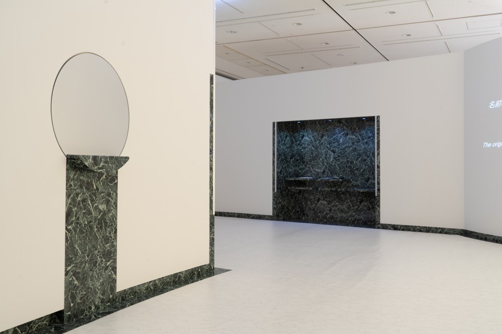 Koki Tanaka’s “everything is everything” fills a room with colorful objects and videos playing on screens in relation to household items like fans, buckets, coolers and step stools. The viewer becomes part of the art as they walk around the objects. For Komiyuki’s “Stand Up! Series/ Shimmering mud at the bottom of the bucket,” the artist’s pale creatures (which look like a small pack of vaguely canine forms) sit on the newly polished wood floor by two imposing center columns, surrounded by projection works and pieces in light boxes.