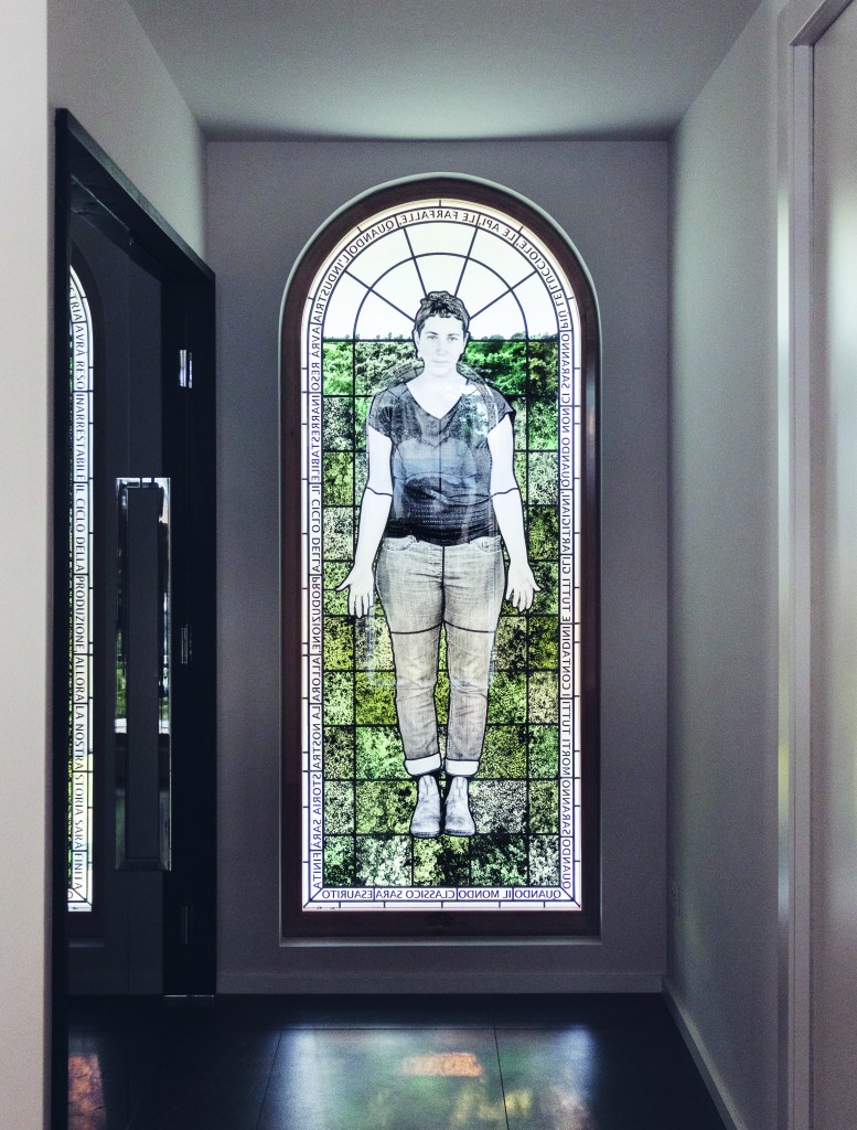Upstairs guests will find a peaceful room with a stained-glass window by JR. “We saw his exhibition in San Gimignano. It just seemed like a perfect way to bring art out to the countryside,” says Gilmore. “And that particular installation was abouthow farmers are having such a hard time even in Italy, just maintaining a living. We wanted to make sure we had a tribute to that in the property. It’s very quiet, almost like a chapel up there.”