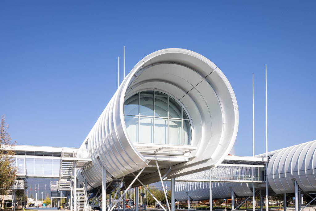The majestic project includes a total surface area of 8,000 square meters, including 1,400 dedicated to exhibitions and 260 for labs. The architecture is the work of Renzo Piano Building Workshop, and is inspired by CERN laboratories and the Large Hadron Collider (LHC), the largest and most powerful particle accelerator in the world. The building also serves as a bridge connecting two areas of CERN once separated—and it develops six meters above the road floor. Seen from above, the center looks like an orbiting space station, but at the same time it reminds us of the LHC tunnels, which stretch for 27 kilometers at a depth of 100 meters. Approximately 4000 square meters of solar panels power this building and other areas of CERN. And the complex is surrounded by a forest of 400 trees and 13,000 shrubs, destined to grow and increase over the years. Additionally, the entire construction process had a net-zero carbon footprint.
