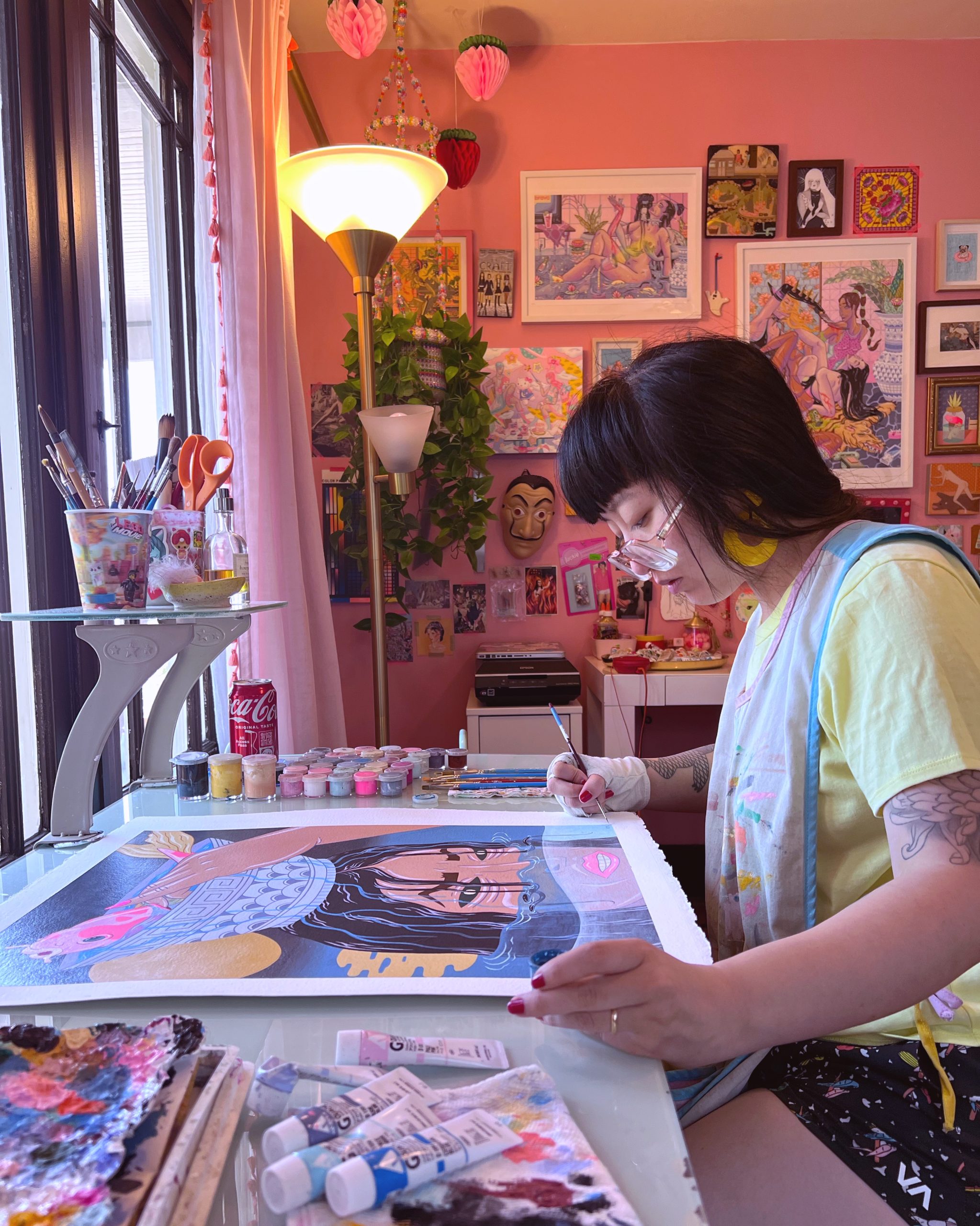 The women in San Francisco-born artist Kristen Liu-Wong‘s paintings feel familiar. Most are trying and failing to relax, some are masturbating and others are aggressively multitasking or reading on the toilet. All of them are trying to navigate the stress that comes with life, be it work or the desires of the id. The figures are, as the artist’s latest exhibition foretells with its title, Hard Pressed. As Liu-Wong’s fourth and largest solo show at LA’s Corey Helford Gallery, Hard Pressed, is a maximalist revelry of contemporary anxieties, soaked in crude humor, sensuality and a stylistic melange of ’90s cartoons and folk art… Read more.