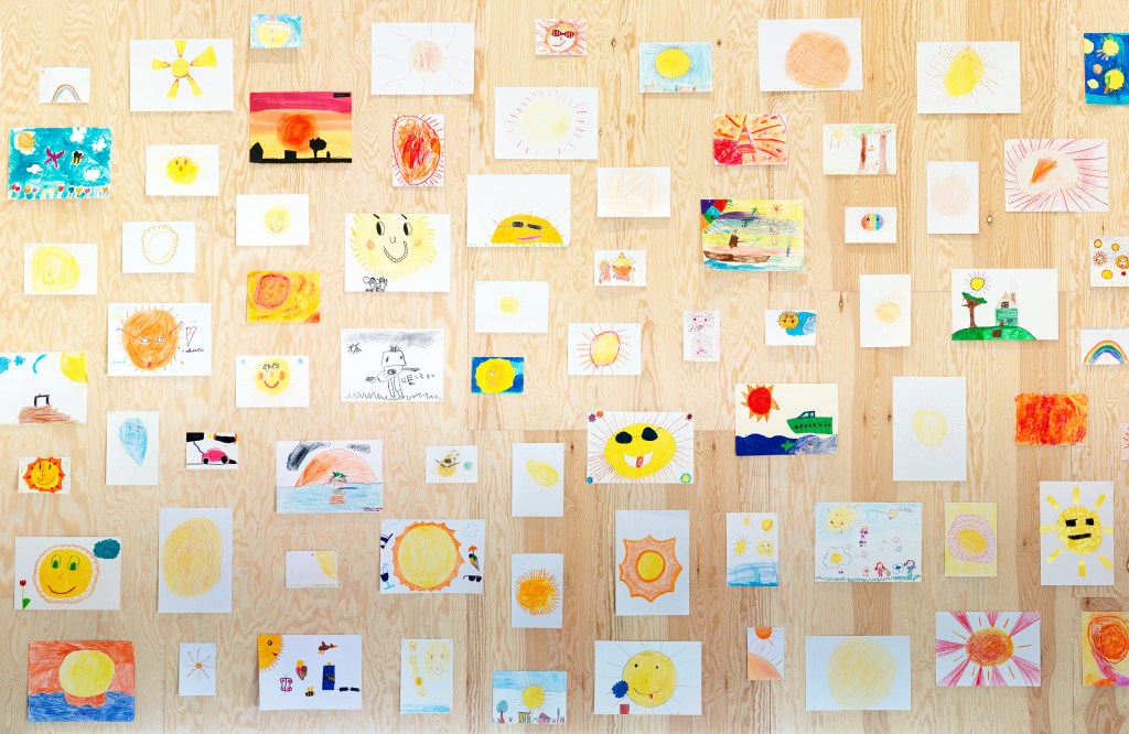 The invitation from Guild Hall aligned with Rondinone’s desire to do a show on light. “There are three rooms, so I knew all three mediums would be explored—drawing, sculpture and painting—all around the sun.” He emphasizes the importance of one particular work “your age and my age and the age of the sun” (2013-present), which is several drawings united. He tells us, “I’ve involved children as part of an ongoing series in different cities—first in Belgium and Mexico City and this, the third station, Long Island—where I ask children from ages six to 12 to draw me a sun.” Unsurprisingly, the youthfulness of the contributions match the vibrance of Rondinone’s own work.